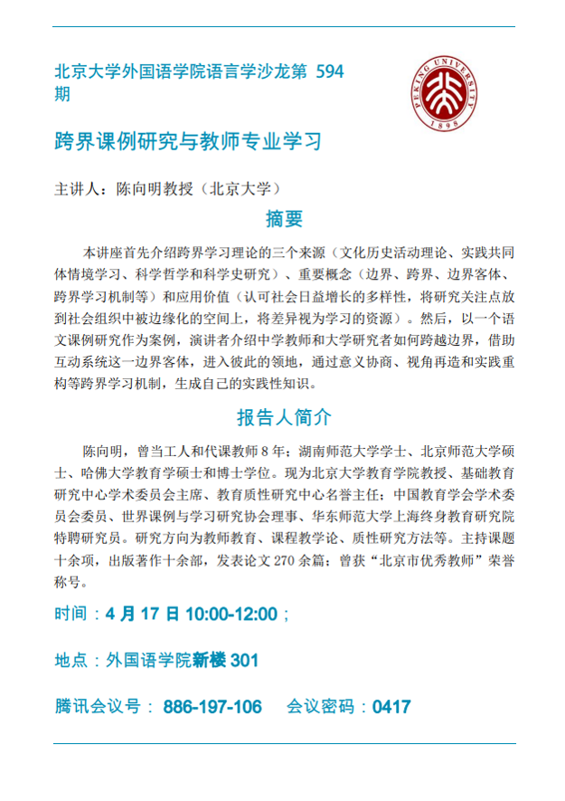 开云官方网页版语言学沙龙第594期:跨界课例研究与教师专业学习