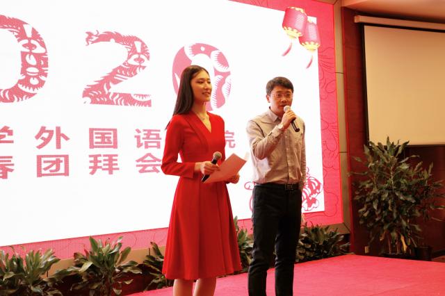欢声笑语中,两位主持人——外院团委书记卢敏老师和西亚系陈飞老师走上舞台,大屏幕播放 “2019年外院大事记”与院庆主视频《北大外院与中国》,团拜会正式开始。