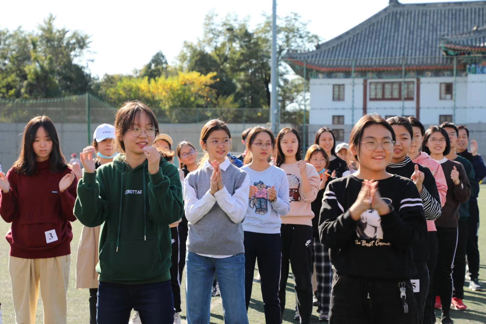 在比赛开始前,主持人为师生介绍游戏规则与赛制。来自体育教研部的特邀教练平安、杨鹏程带领师生进行热身准备,全体参赛师生合影留念。