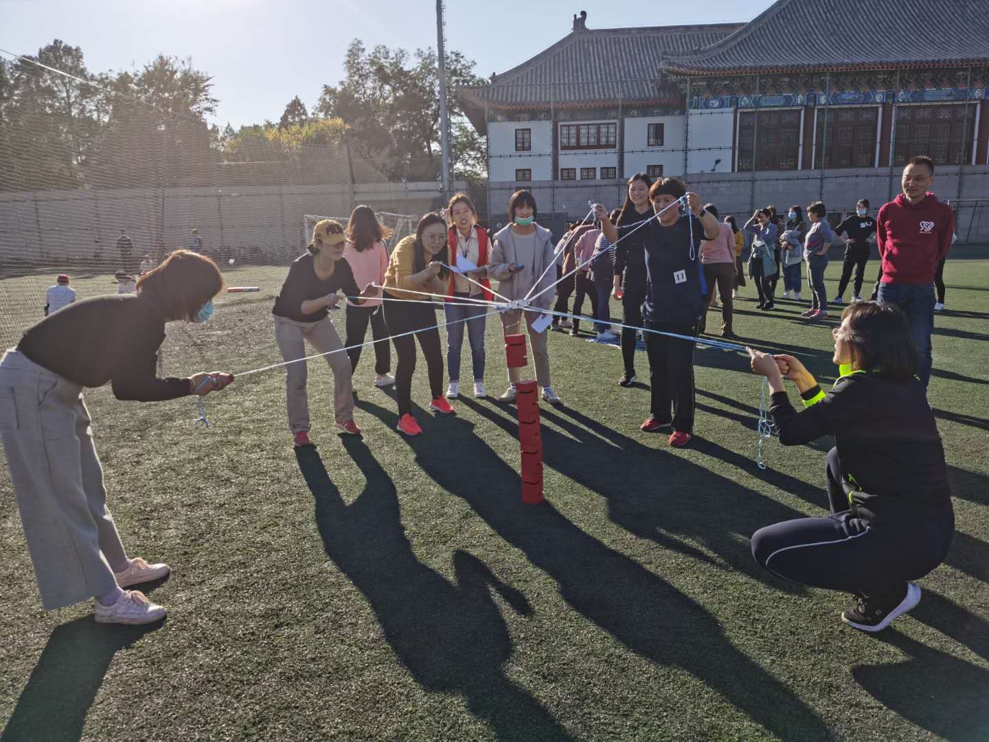 比赛采取轮换积分制,西半区进行竞走毛毛虫、夹西瓜接力、合力搭建三项;东半区进行珠行万里、愤怒的小鸟、车轮滚滚三项,共六个项目同时进行。13支学生队伍和3支教师队伍在场上展开了激烈的角逐。
