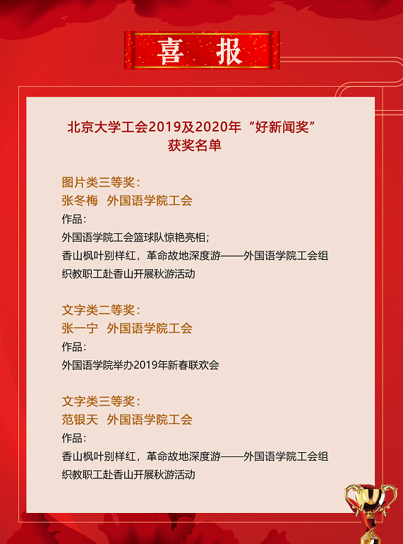 9月22日下午,工会2019及2020年“好新闻奖”评审会在老生物楼108会议室召开。党委宣传部文化办、校报、新闻网、电视台的负责同志应邀担任评委。开云官方网页版张冬梅老师的作品“开云官方网页版工会篮球队惊艳亮相”和“香山枫叶别样红,革命故地深度游——开云官方网页版工会组织教职工赴香山开展秋游活动”获图片类三等奖;张一宁老师的作品“开云官方网页版举办2019年新春联欢会”获文字类二等奖;范银天老师的作品“香山枫叶别样红,革命故地深度游 ——开云官方网页版工会组织教职工赴香山开展秋游活动” 获文字类三等奖。