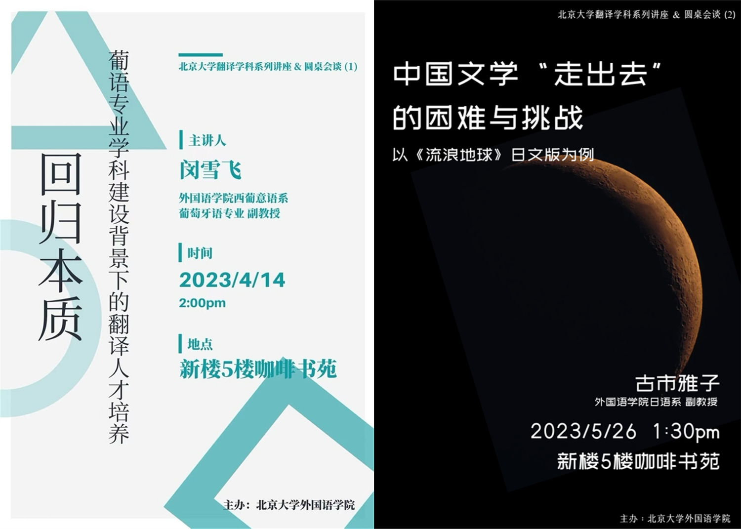 第二期活动于2023年5月26日下午在同一地点进行,主讲人为日语系古市雅子老师,朝韩语系文丽华老师,法语系段映虹、章文老师,日语系岳远坤、刘琳琳老师,西葡意语系闵雪飞、成沫老师和外国语言学及应用语言学研究所冯硕老师参加了讨论,也吸引了很多本院各专业同学的关注。古市老师作为刘慈欣小说《流浪地球》和《赡养上帝》日本版的译者,围绕“中国文学‘走出去’的困难与挑战——以《流浪地球》日文版为例”这一主题展开介绍。她从国内、国外和翻译过程本身三个方面出发,展示了译者、出版社、发行商等多个主体可能在中国文学扬帆出海的过程中所起到的作用及可能诱发的问题。在座的老师、同学们就日本翻译市场、科幻文学译介、文化负载词翻译等问题进行了交流,讲座获得圆满成功。