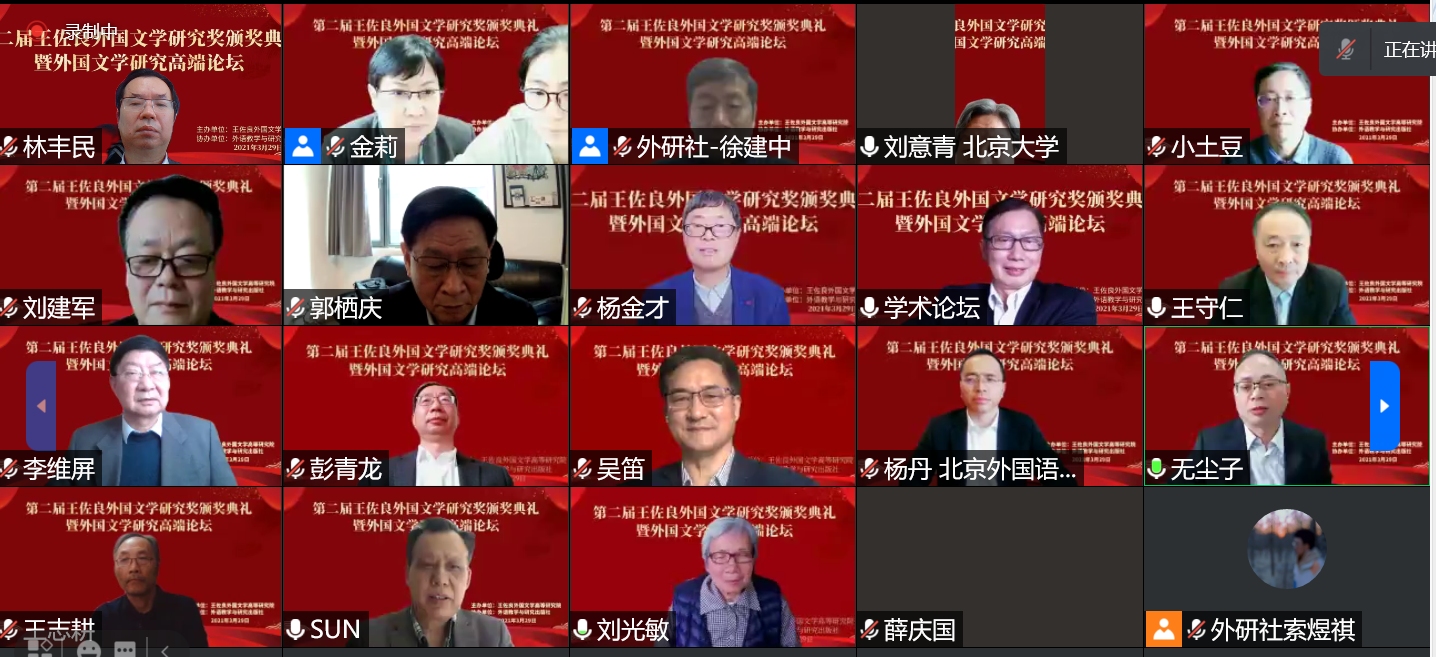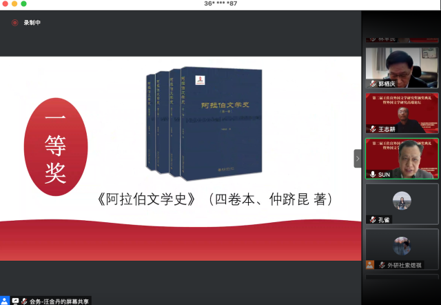 王佐良外国文学高等研究院院长、评奖委员会主席金莉教授介绍了评选工作的开展情况,60名初评专家选出了16部作品进入第二轮评选,最终8部作品进入终评,第三轮的终评专家又经过三轮投票最终确定获奖名单。仲跻昆教授撰写的《阿拉伯文学史》摘得本届大奖的桂冠。