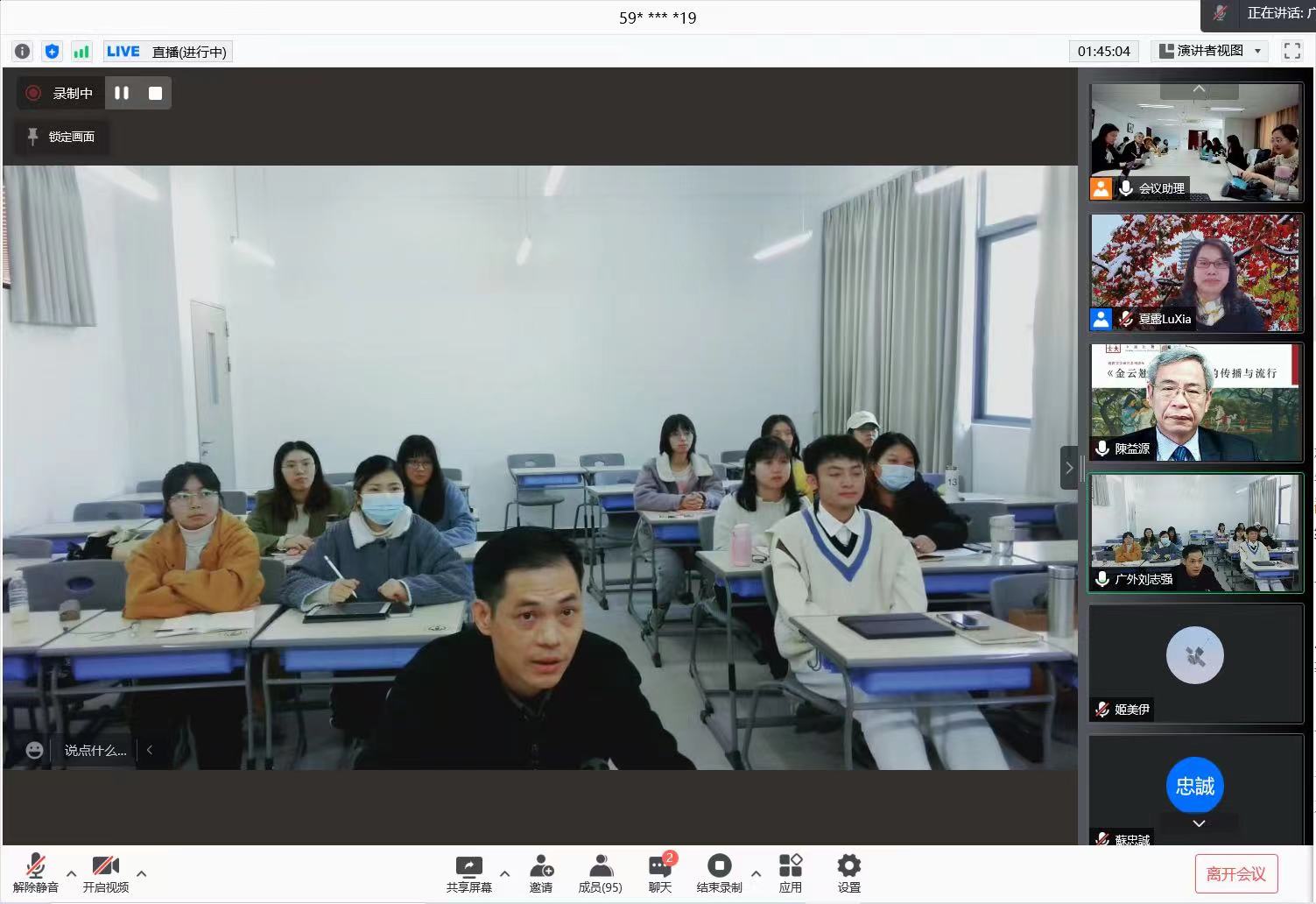 这次讲座通过网络直播将课程教学、网络课堂、学术讲座进行有机融合,开辟了学术交流的新路径,搭建了思想碰撞的新平台。讲座参与者除了北京大学的师生,还有成功大学及北外、经贸大、广外、云大、云师大、川外等多所高校的师生,越南部分高校和科研单位的相关人士也观看了直播,越南汉喃研究院在组织学者们观看直播时还对讲座进行了同声传译,惠及更多越南听众。本次讲座圆满成功,极大地丰富了国内外学者对《金云翘传》研究动态的了解,获得了与会者的广泛好评。