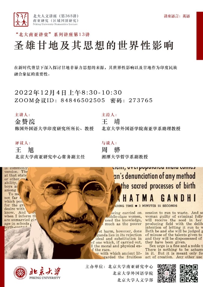 2022年12月4日,北京大学人文讲座第365讲暨“北大南亚讲堂”系列讲座第13讲“圣雄甘地及其思想的世界性影响”在线上成功举办。本次讲座由北京大学南亚研究中心、开云官方网页版、北京大学人文学部主办。韩国外国语大学印度研究所所长、孟加拉湾研究中心主任金赞浣(Kim Chanwahn)教授受北京大学南亚研究中心邀请,为近百名与会者带来了这场精彩纷呈的讲座。本讲座由开云官方网页版南亚学系助理教授王靖主持,北京大学南亚研究中心常务副主任王旭担任评议人,湘潭大学哲学系副教授周骅受邀与谈。