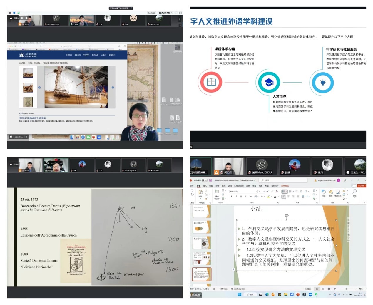 成沫老师以“意大利中古诗歌及但丁数字化项目”为例,具体地展示了数字人文工具在外语教学方面的影响。同时,在科学研究方面,他介绍了一些已有的数字平台、多媒体数据库,使研究者实现了从“图书馆之间的旅行”变成了“手稿数据库中之间页面的切换”。