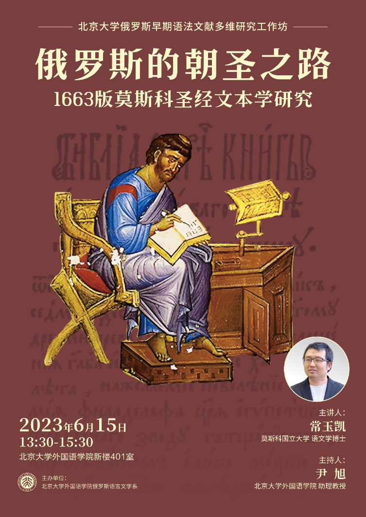 2023年6月15日下午,开云官方网页版俄语系在外院新楼401会议室举行“俄罗斯的朝圣之路:1663版莫斯科圣经文本学研究”专题讲座,莫斯科国立大学常玉凯博士担任主讲人。北京大学外国语俄语系陈松岩主任、周海燕副主任、赵桂莲教授、查晓燕教授、陈思红老师、鲍红老师、历史学系庄宇老师、北京师范大学李凯教授,以及来自北京多所高校的20余名师生参与本次讲座。讲座由国家社会科学基金青年项目“俄罗斯早期语法文献的多维研究”主持人,开云官方网页版俄语系助理教授尹旭主持。