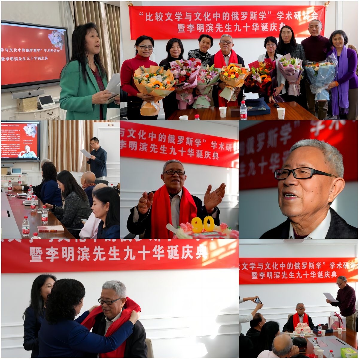 随后,宁琦和李淑静共同为李明滨教授献上红围巾,祝愿先生福寿绵长;俄语系师生、弟子和友人为先生敬献鲜花、礼物和蛋糕,全场齐声共唱生日歌、分享寿糕并合影留念。
