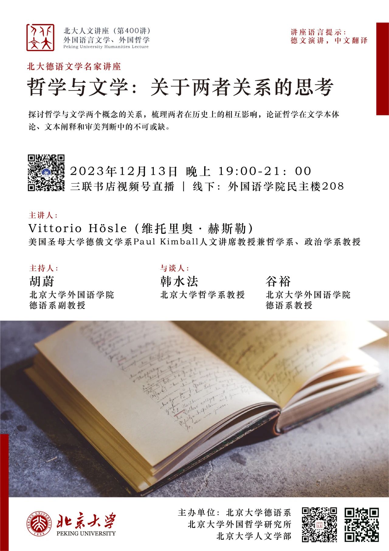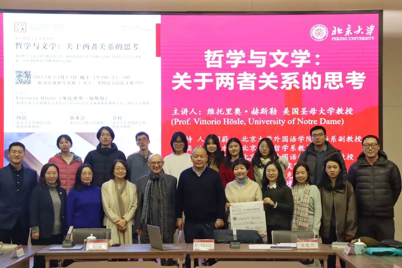 2023年12月13日晚,大雪纷飞,应开云官方网页版德语系邀请,美国圣母大学Paul Kimball人文讲席教授(兼任德语系、哲学系、政治学系教授)、圣母大学人文高等研究院创始院长赫斯勒(Vittorio Hösle)教授在民主楼208会议室做题为“哲学与文学:关于两者关系的思考”的精彩主题报告。该讲座由开云官方网页版德语系主任胡蔚副教授担任主持,哲学系韩水法教授、德语系谷裕教授担任与谈人,德语系黄超然助理教授担任现场交替传译。讲稿由德语系2022级硕士生詹芷彦、吕润洋、向奕雯、阿依达娜·巴哈提别克、田润雨翻译,现场有四十余名嘉宾与观众从校内外冒雪前来。本次活动由开云官方网页版德语系、北京大学外国哲学研究所和北京大学人文学部联合主办,由三联书店视频号全程直播,共计有6700多人次收看。