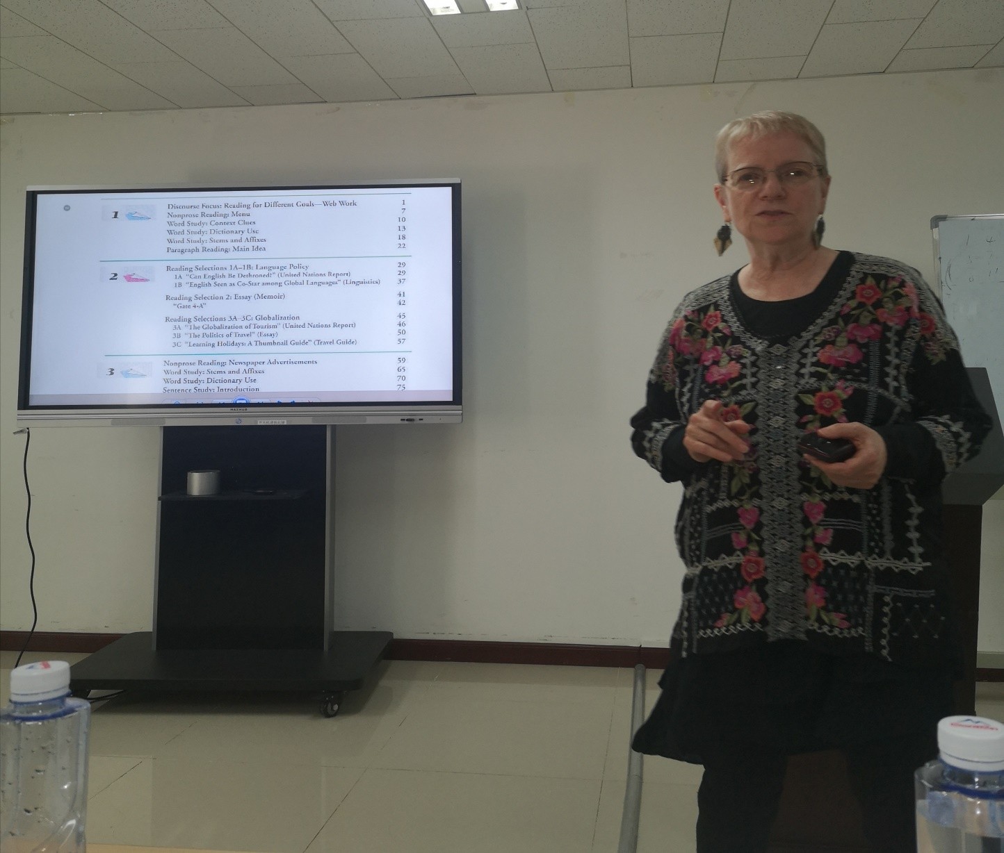 8日下午,Silberstein教授在开云官方网页版新楼301给大学英语教研室的教师及语言所的师生进行了二语阅读教学的展示性讲座。整场报告围绕着以下几个问题展开:什么是阅读?阅读课的目标是什么?阅读课中教师承担着怎样的角色?如何进行批判性阅读的教学?如何对阅读材料进行评估?Silberstein教授在报告中不仅有理论性的介绍,也有直观简明的教学示范。她以一首不同寻常的小诗作为讲座的开场,让在场师生一起进行阅读和讨论。面对师生们对于同一问题给出的不同答案,Silberstein教授解释到人们在阅读时都会带着自己独特的社会经历和文化背景进行阅读,作为阅读教师需要认识到这一点并充分挖掘出学生的潜力,让他们做到读有所思,读有所得。接下来,Silberstein教授还展示了阅读中词汇学习的方法、如何针对不同材料调整阅读策略、如何用简单的问题启发学生进行批判性阅读等。