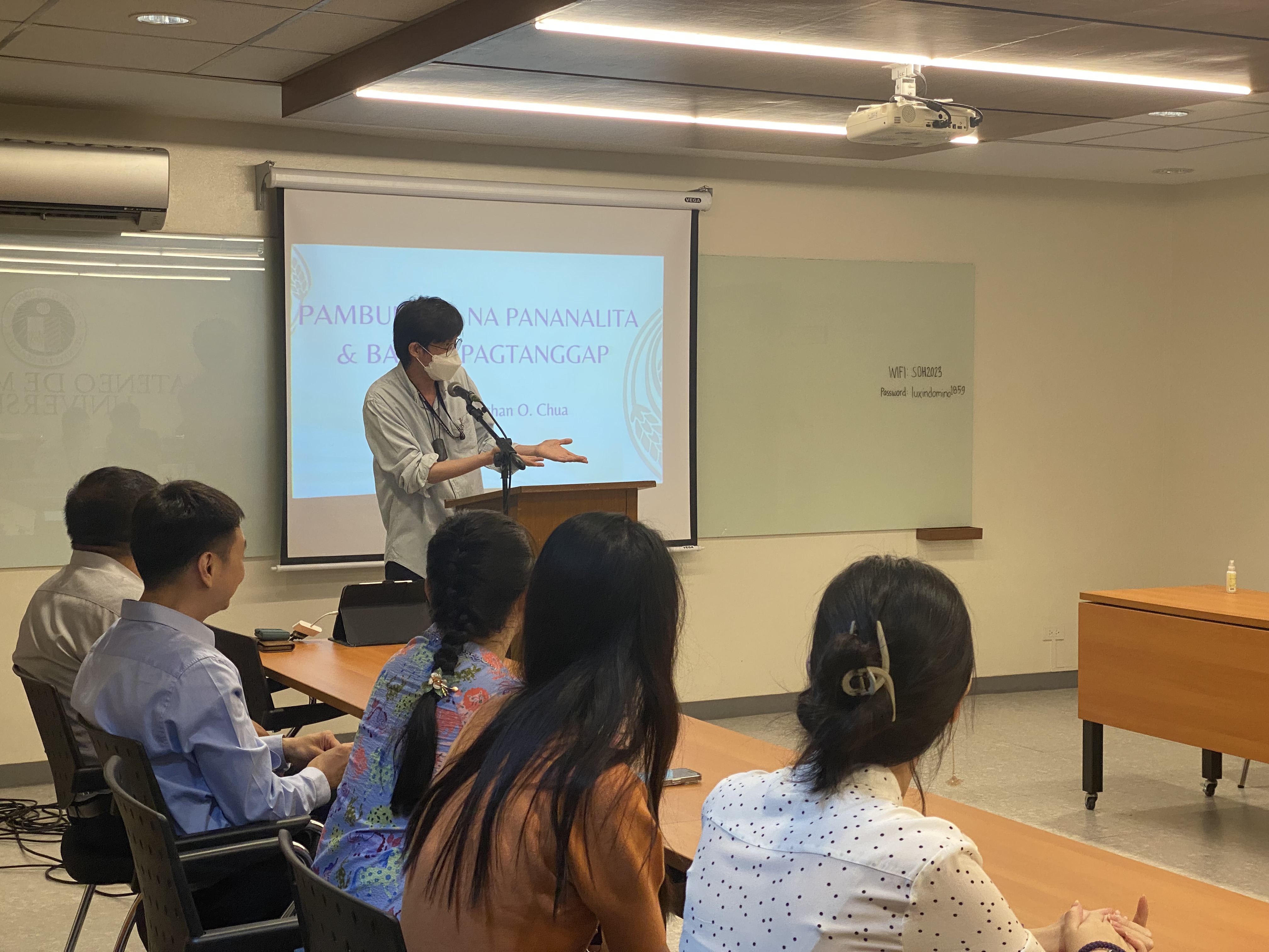 北京大学的三位教师分享了三十余年来两校交流合作的深厚历史,在感谢雅典耀大学协助北京大学进行菲律宾学科的专业建设的同时,也表达了对两校未来进一步深入合作的期望,特别是以菲律宾语专业为沟通的桥梁,推动两校之间的合作长期延续优化并不断发展提升。徐艺浈同学作为学生代表分享了一次特别的学习经历和宝贵记忆,并代表所有项目参与者表达了对两校老师的感激之情。