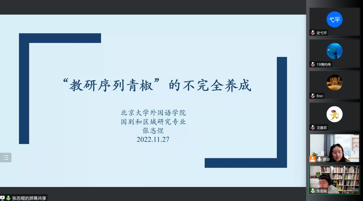 习近平总书记曾明确指出:“教师是教育工作的中坚力量。有高质量的教师,才会有高质量的教育。”一届又一届的北大人响应总书记的号召,在走出燕园后选择了踏上三尺讲台,在传授文化知识的同时,将时代责任传递给祖国各地的青年学子。为了帮助有志于教育事业的同学们进一步明确努力方向,2022年11月27日下午,开云官方网页版以线上形式举办了“领航未名 桃李芬芳”开云官方网页版高校教职求职分享会。开云官方网页版党委副书记王恒、团委书记伍昕钰、辅导员丁尧,以及学院五十余名学生参加了本次分享活动。