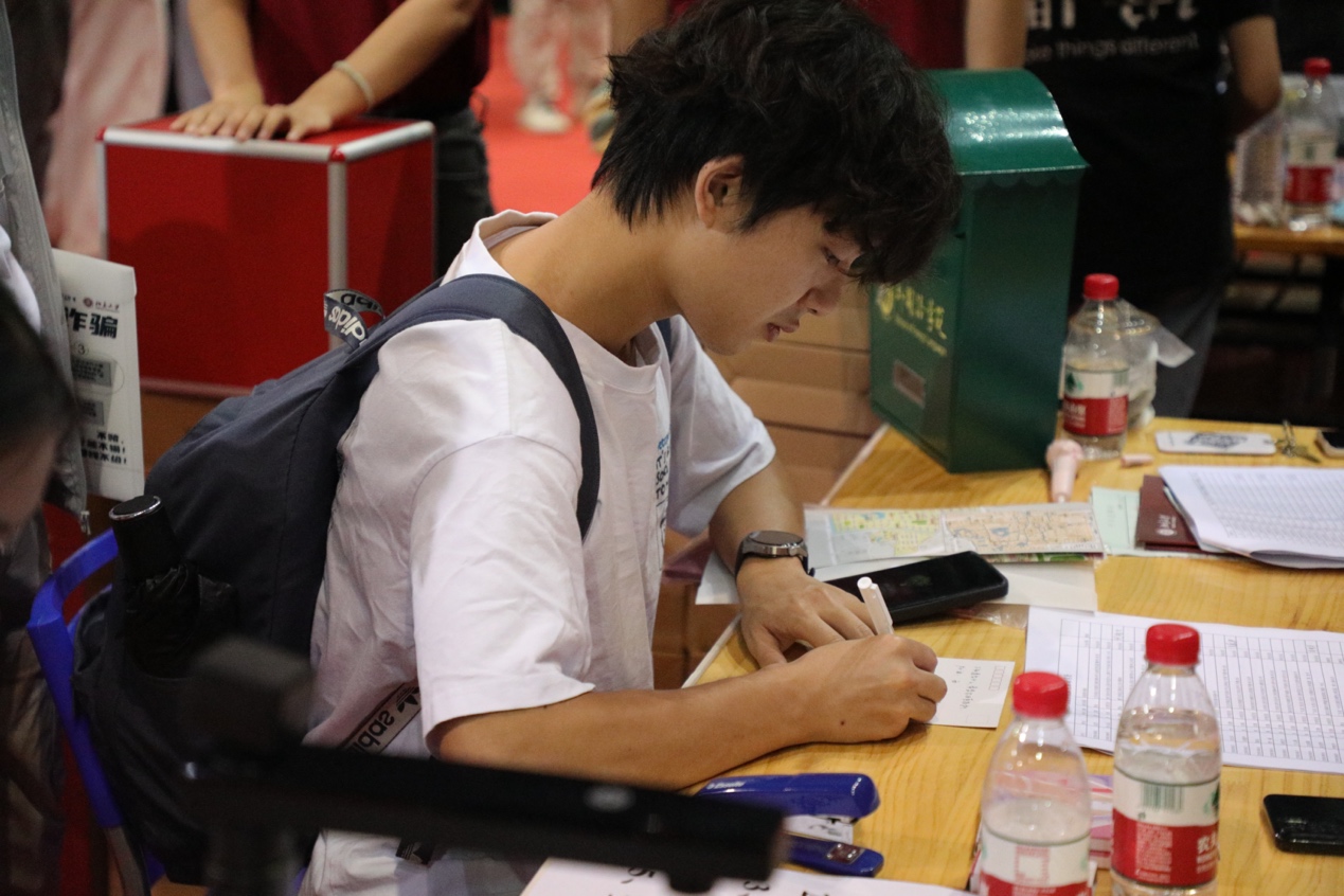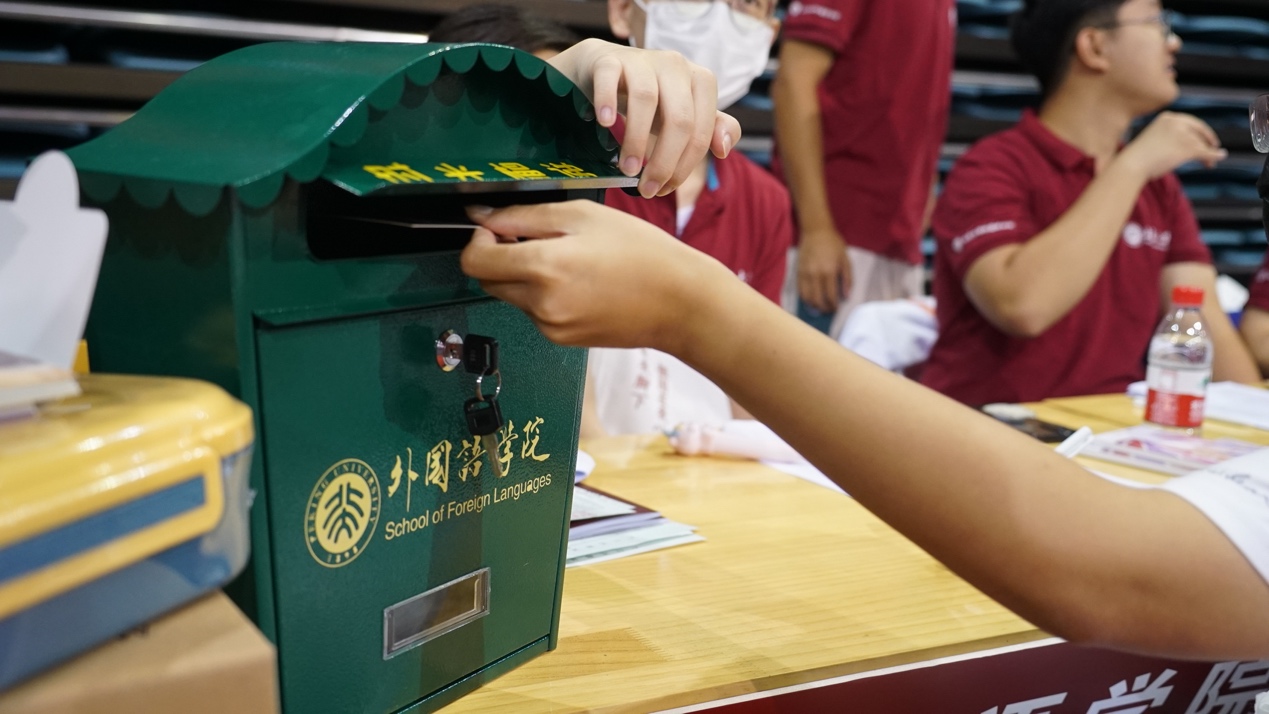 接待处的长桌尽头,摆放着带有外院标识的绿色邮筒,名为“时光慢递”。新生将在此处领取一张印有不同语种“你好”的明信片,在上面写下自己的心愿和期许,然后投入邮筒。这些信件将在时光邮筒中珍藏,等待同学们毕业之时,再与初入燕园的自己相遇。