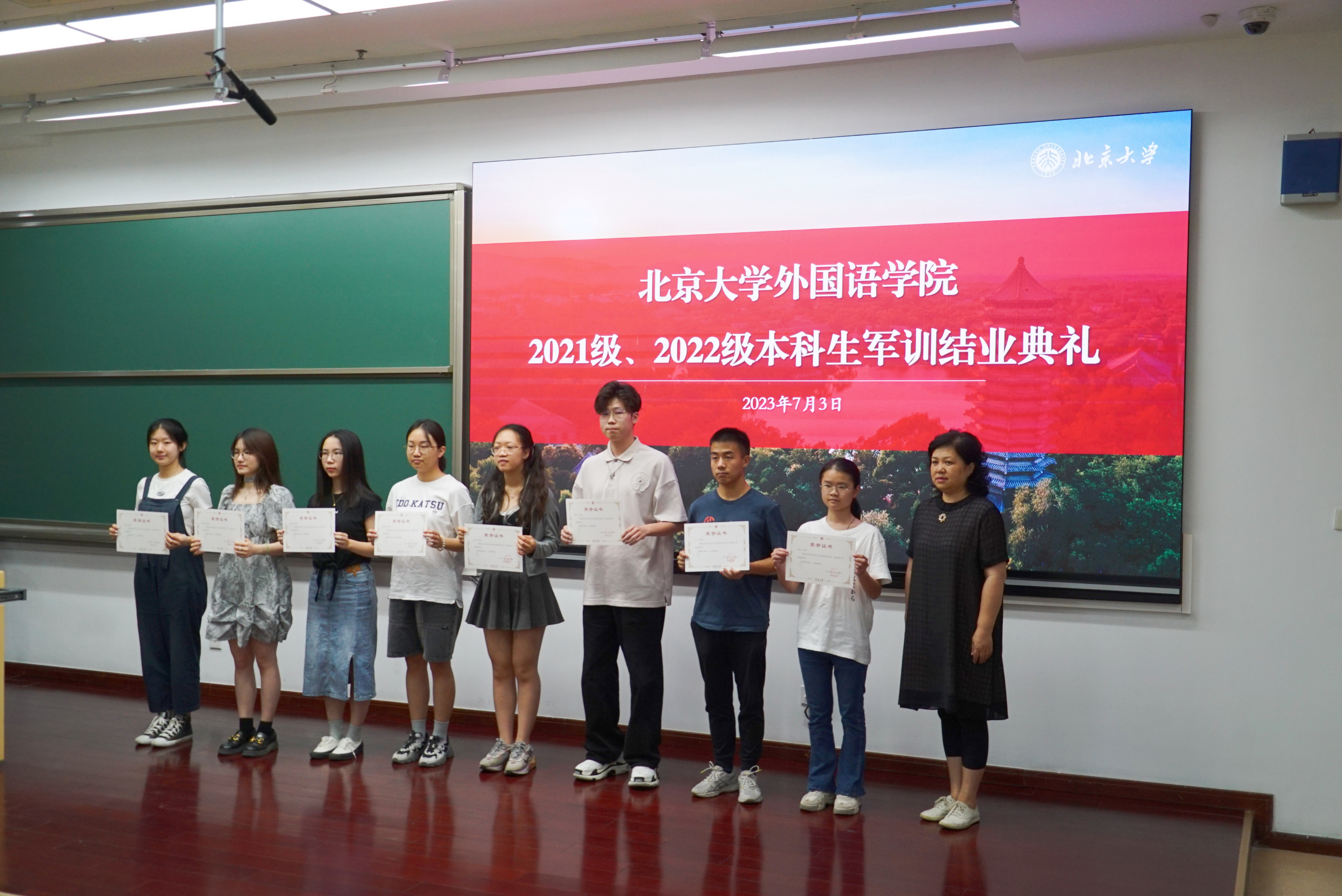 2023年7月3日上午,开云官方网页版在理科教学楼208教室举办2021、2022级本科生军训结业典礼。开云官方网页版党委书记李淑静,西葡意语系助理教授、十三连五班领队教师成沫,德语系助理教授、十三连一班领队教师黄超然,博士后、十二连一班领队教师孔雀,博士后、十三连六班领队教师王天驰,院办公室副主任、党委专职组织员、十二连二班领队教师冯一帆,团委书记伍昕钰,团委副书记、十三连三班领队教师杨轶佳,团委副书记、十三连四班领队教师杜姝格,团委副书记、十三连二班领队教师熊珊儿及开云官方网页版2021、2022级全体参训学员出席仪式。典礼由开云官方网页版党委副书记王恒主持。