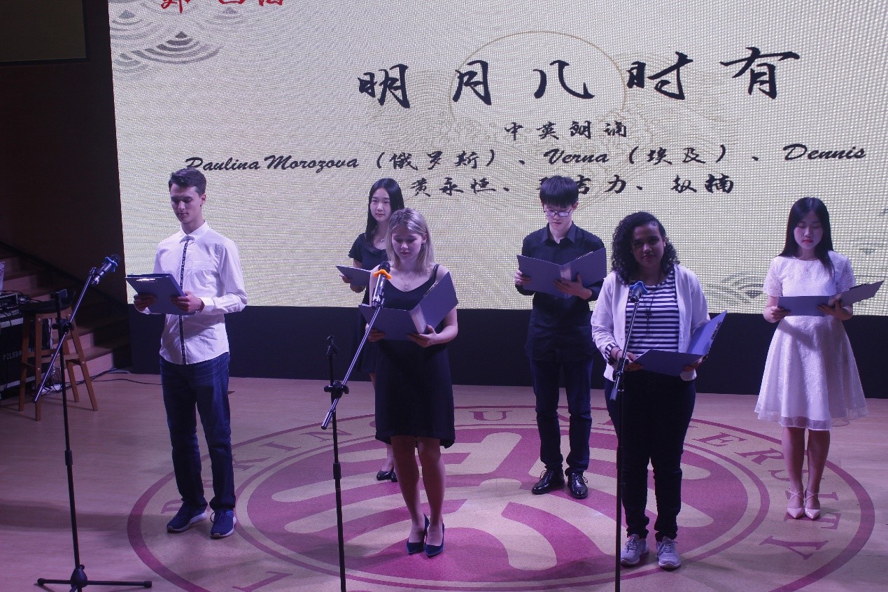开场徐稚芳老师与王弘毅同学中俄双语诵读普希金名篇《致凯恩》。“外·四海一心”板块,胡壮麟老师、孙亦丽老师和张义荀同学中英对诵唐诗《寒食》《春雨》《章台夜思》;2014级菲律宾语专业尹子尤同学演唱原创歌曲《语路》,献礼外院文化节,万语千言,融进歌声里;2014级泰语专业本科班荣获北京大学“班级五四奖杯”,他们自编自演短剧《毕业班会》,重温充满温情与力量的北大奋斗之旅;来自韩国、俄罗斯、墨西哥、巴基斯坦、埃及的留学生朋友,和中国同学一同中英双语诗诵《明月几时有》,优美的韵律、深邃的意涵、古今中外的互融互通令人动容。