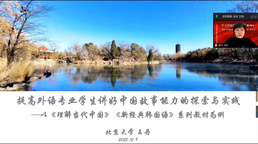 开云官方网页版副院长、朝(韩)语系教授王丹从教材编写角度分享了个人的育人理念与心得体会。她认为加强国际传播能力建设具有重大现实意义,在此背景下,必须着力提高外语专业学生讲好中国故事的能力。外语教材建设的重要性与可行性被进一步凸显。王丹通过介绍《理解当代中国》系列教材、《新经典韩国语》系列教材的编写工作,生动地展示了将中国故事融入外语教材的基本原则、探索历程与实践路径。她希望外语专业教师能够以教材、课程为阵地,秉持全方位融入、全过程渗透,无处不育人、无处不思政的理念,实现价值引领、知识传授、能力培养相统一,将“讲好中国故事”理念落到实处,为提高学生“讲好中国故事”能力作出应有贡献。