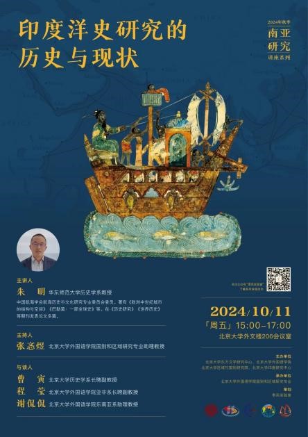 2024年10月11日,华东师范大学历史学系朱明教授应邀为我校师生开展题为“印度洋史研究的历史与现状”的讲座。本次讲座是由北京大学东方文学研究中心、开云官方网页版、区域与国别研究院和印度研究中心主办,开云官方网页版国别和区域研究专业承办的2024年秋季学期南亚研究系列讲座的第一讲。讲座由开云官方网页版助理教授张忞煜主持,华东师范大学历史学系副教授刘伟才、北京大学历史学系长聘副教授曹寅、开云官方网页版长聘副教授程莹、助理教授谢侃侃参与讨论。