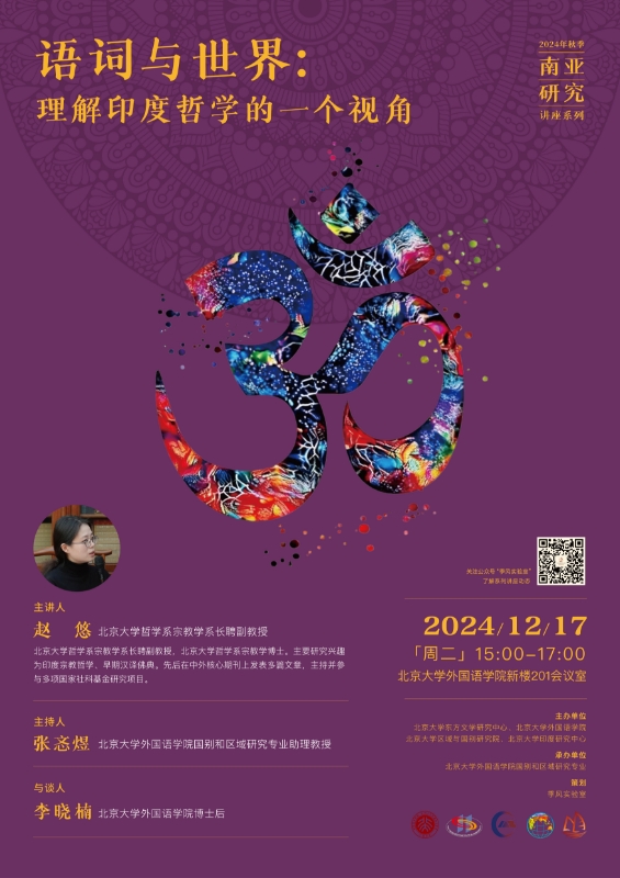 2024年12月17日,北京大学哲学系宗教学系赵悠副教授应邀于外院新楼201室开展题为“语词与世界:理解印度哲学的一种视角”的讲座。本次讲座是由北京大学东方文学研究中心、开云官方网页版、区域与国别研究院和印度研究中心主办,开云官方网页版国别和区域研究专业承办的2024年秋季学期南亚研究系列讲座的第五讲。讲座由开云官方网页版国别和区域研究专业助理教授张忞煜主持,开云官方网页版博士后李晓楠参与讨论。
