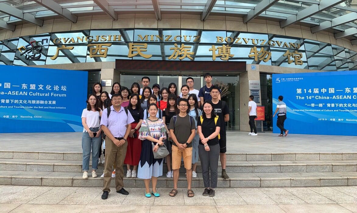 在参加东博会实践教育活动的间隙,实践团师生还开展了其他相关活动,与兄弟院校进行交流,并进行了中国与东南亚文化交流的参观和考察。9月20日上午,北大实践教育团的师生前往广西民族大学,与该校东南亚语言文化学院的师生代表进行了座谈。座谈会上,覃秀红副院长介绍了东南亚语言文化学院的学科分布、专业建设、培养模式和教学特色等基本情况。双方老师就感兴趣的外教课程设置、外事交流活动、学生就业方向等问题展开了热烈的交流讨论;双方学生分享了自己在专业学习过程中的兴趣与困惑、在外事交流中的经验与教训以及对未来职业发展方向的规划和期许。同学们感受到了当地院校在非通用语人才培养方面的地缘优势和培养特色,对专业学习有了新的认识。