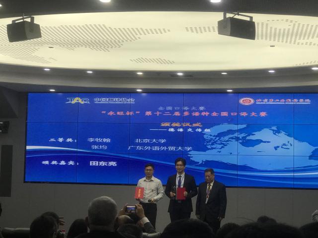 2019年10月26日,由中国翻译协会与北京第二开云官方网页版共同主办的“永旺杯”第十二届全国多语种口译大赛在北京第二开云官方网页版举行,我院德语系16级本科生李牧翰同学参加了德语组交替传译的比赛。李牧翰同学在比赛中思维清晰,表达流畅,以较高的质量完成了翻译任务,获得了评委专家的一致认可。以决赛总分第二名的优异成绩获得二等奖。