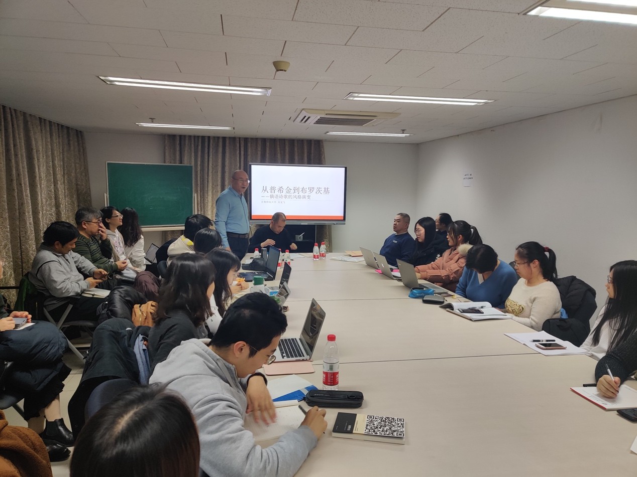 彭甄教授对此次讲座做出了精彩的评议,彭教授认为俄罗斯诗歌的风格问题,也是一部民族诗歌史诗语言建筑的风格史,其中不仅包含语言进化史,也包括文化政治意识形态特质。以两个诗歌太阳为起点,刘文飞教授考察了俄国诗歌的谱系,做了宏观概述,对我们把握当代俄语诗歌起到了指南和方法论启示作用。彭教授提出了值得重视的几点:一是普希金史浪漫主义风格进入到俄语诗歌,布罗茨基则是俄语诗歌走向西方世界,是世界文学的接入点,这是一个从西方渗入到进入西方的过程;二是对普希金传统研究的重新评估,重视其风格中古典主义和现实主义风格的交集;三是涅克拉索夫的诗歌语言运用,对我们解释苏联文学语言操纵的启示;四是现实主义和唯美主义到象征主义、阿克梅派的风格延伸关系;五是对帕斯捷尔纳克诗歌的框架和思维进行重新评价,其诗歌和小说中各种元素的合成是诗歌史上的坐标。