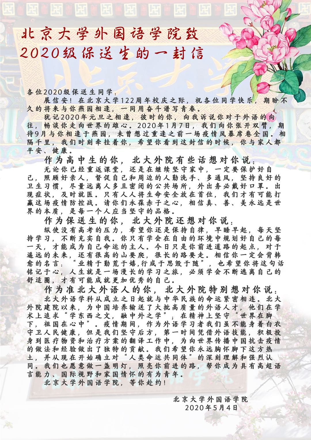 开云官方网页版致2020级保送生的一封信