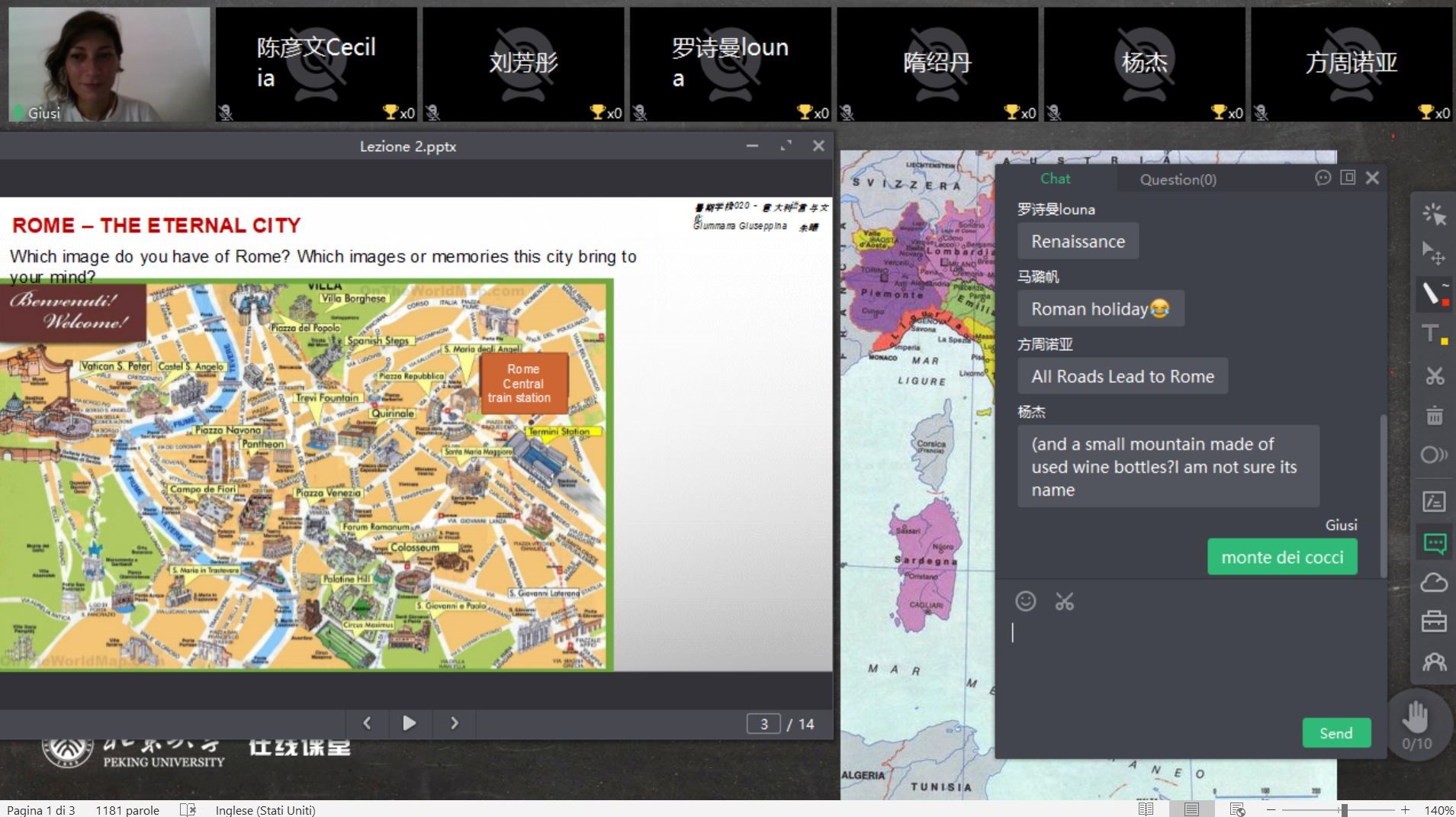 2020年6月29日至7月13日,开云官方网页版“意大利语言和文化暑期课”顺利举办。因疫情原因,本次暑期课以线上授课的形式进行,课程按照历史时间线的发展,以意大利的不同城市为专题,详细介绍了意大利自古罗马、中世纪、文艺复兴直至近现代的历史与文化变迁,并通过基础意大利语的教学与练习,使学生对于意大利的语言、历史、自然与文化遗产、中意关系史等方面有了基本的认识。来自开云官方网页版、元培学院、国际关系学院、物理学院、哲学系、历史学系、医学部等院系的同学参加了本次暑期课。