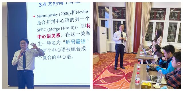程老师报告的研究是从跨语言比较展开的。程老师梳理出,汉语的物质量词,如“瓶”“锅”等,它所在名词性结构与英语的假部分格结构(例如 two cups of tea)相似,其中,汉语的物质量词和英语表示“部分”的成分(如cups)之间存在平行关系。二者的语义分类相近、语义都可诠释为“可分性”、有计量和容器两种含义、在名词性结构中不可省略、可以接受形容词修饰,这些表现可以为二者的平行性提供有力的证据。而汉语的个体量词则与英语的复数形态平行,这一点也能够从语义和分布,以及量词系统的跨语言比较和历时发展上找到证据。基于这些观察,程工老师在最简方案和分布式形态学的框架下提出,根据名词性结构和动词性结构之间的平行性,可以假设名词性结构中也有强弱两种轻名词(n*和n),物质量词以词根的形式进入句法结构,选择一个名词性短语作为补足语,后并入弱轻名词;而个体量词直接生成在强轻名词核心词上,如此一来,可数名词和物质名词的区别可以归结为直接和强轻名词结合的可能性,跨语言的差异也得到了统一的解释。
