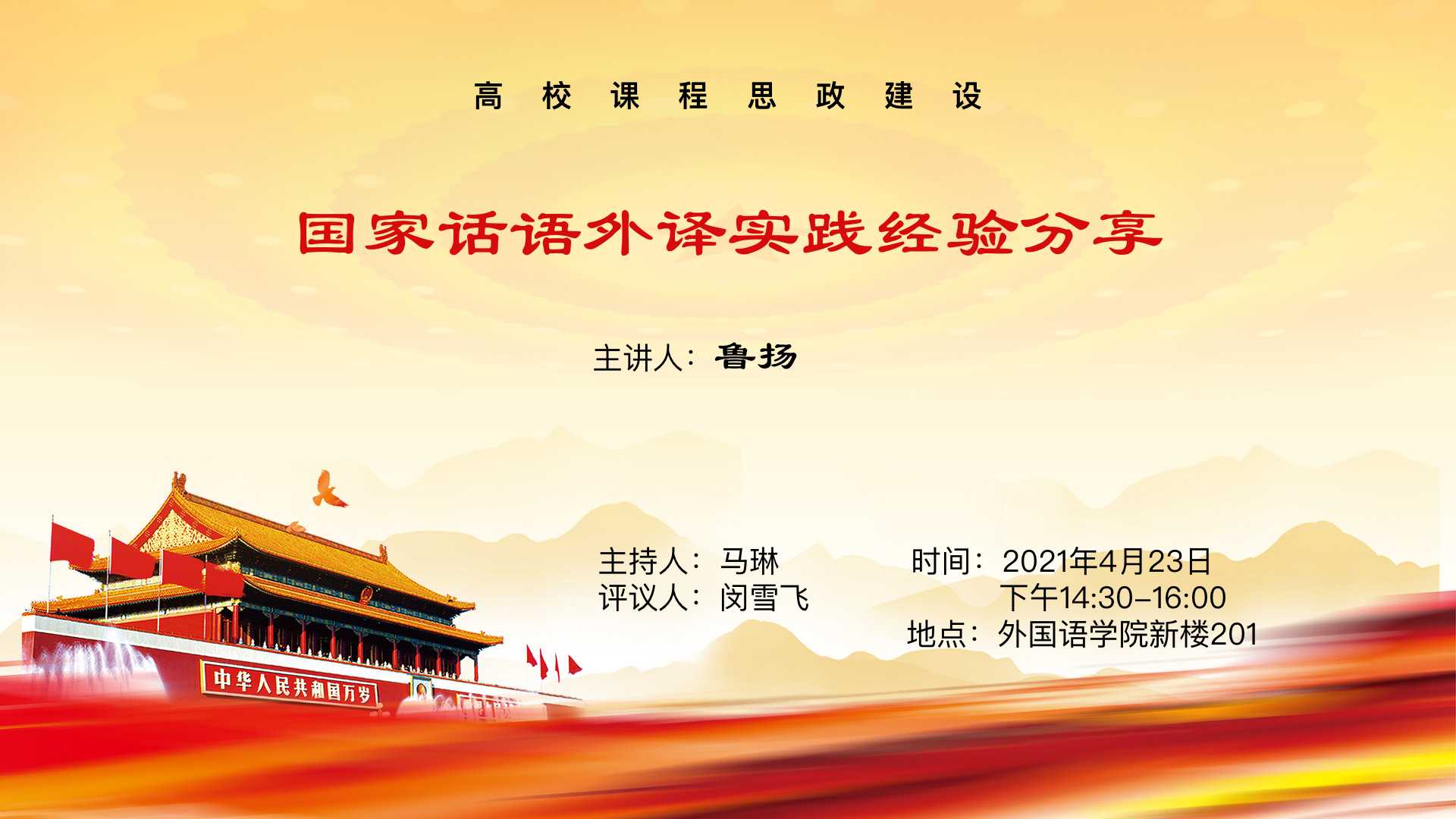 2021年4月23日下午,北京大学葡萄牙语专业举办以国家话语外译为主题的线下讲座,邀请人民网葡文版主编、《习近平谈治国理政》第三卷译者之一鲁扬老师主讲,为葡语专业师生带来思政学习与翻译实践结合的生动一课。作为葡萄牙语专业2021年春季课程思政建设系列活动的重要环节,本次讲座由葡语专业博雅博士后马琳老师主持,葡语专业负责人闵雪飞副教授评议。