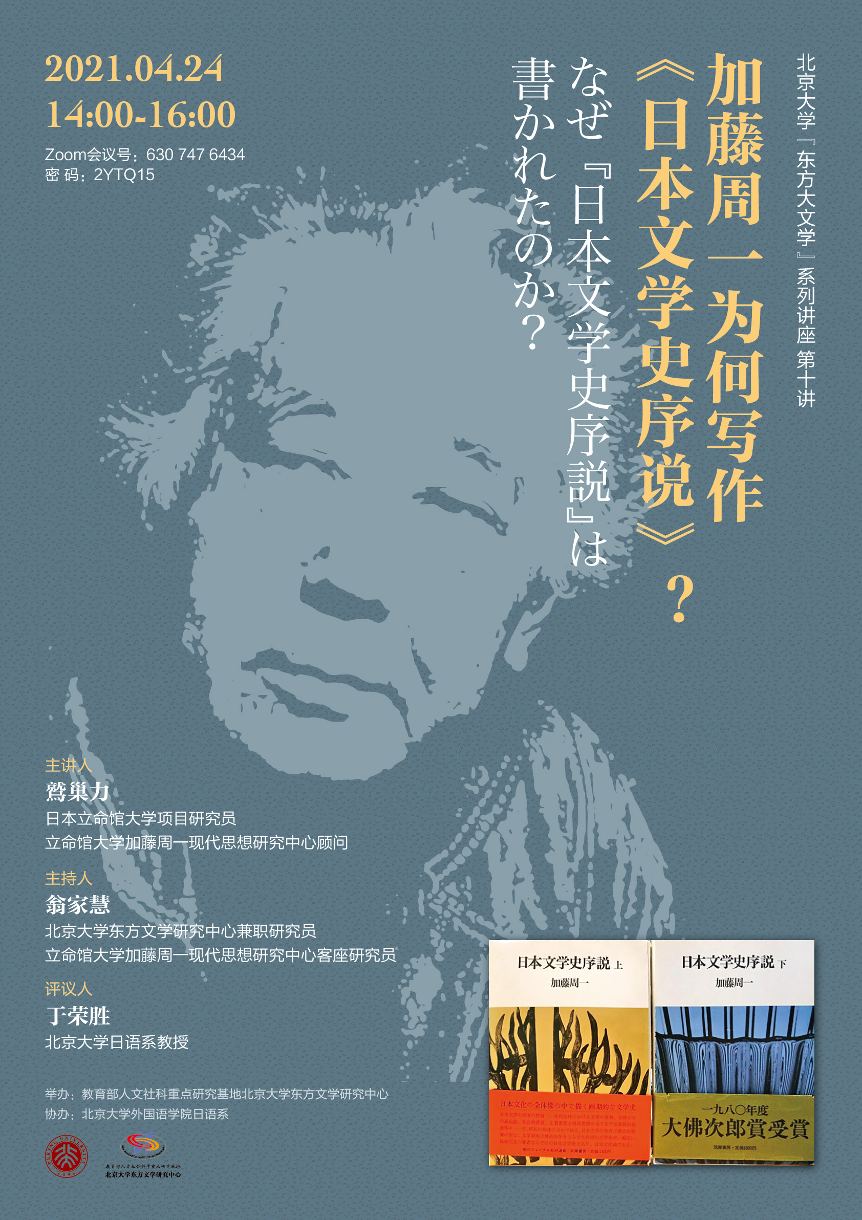 4月24日,北京大学东方文学研究中心成功举办“东方大文学”系列讲座第十讲“加藤周一为何写作《日本文学史序说》?”。主讲人鷲巢力研究员曾担任日本立命馆大学加藤周一现代思想研究中心主任,筹建并成立了加藤周一文库,现为该中心顾问。其个人专著有《阅读加藤周一》(2011)《加藤周一如何成为“加藤周一”:重读〈羊之歌〉》(2018)等,在加藤周一现代思想、日本战后文学史和思想史研究领域具有重要影响。受疫情影响,讲座采用线上方式进行,国内外高校师生近百人观看并参与了讨论。本次讲座由开云官方网页版日语系协办,东方文学研究中心主任助理、日语系副教授翁家慧担任主持,日语系教授于荣胜担任评议人。