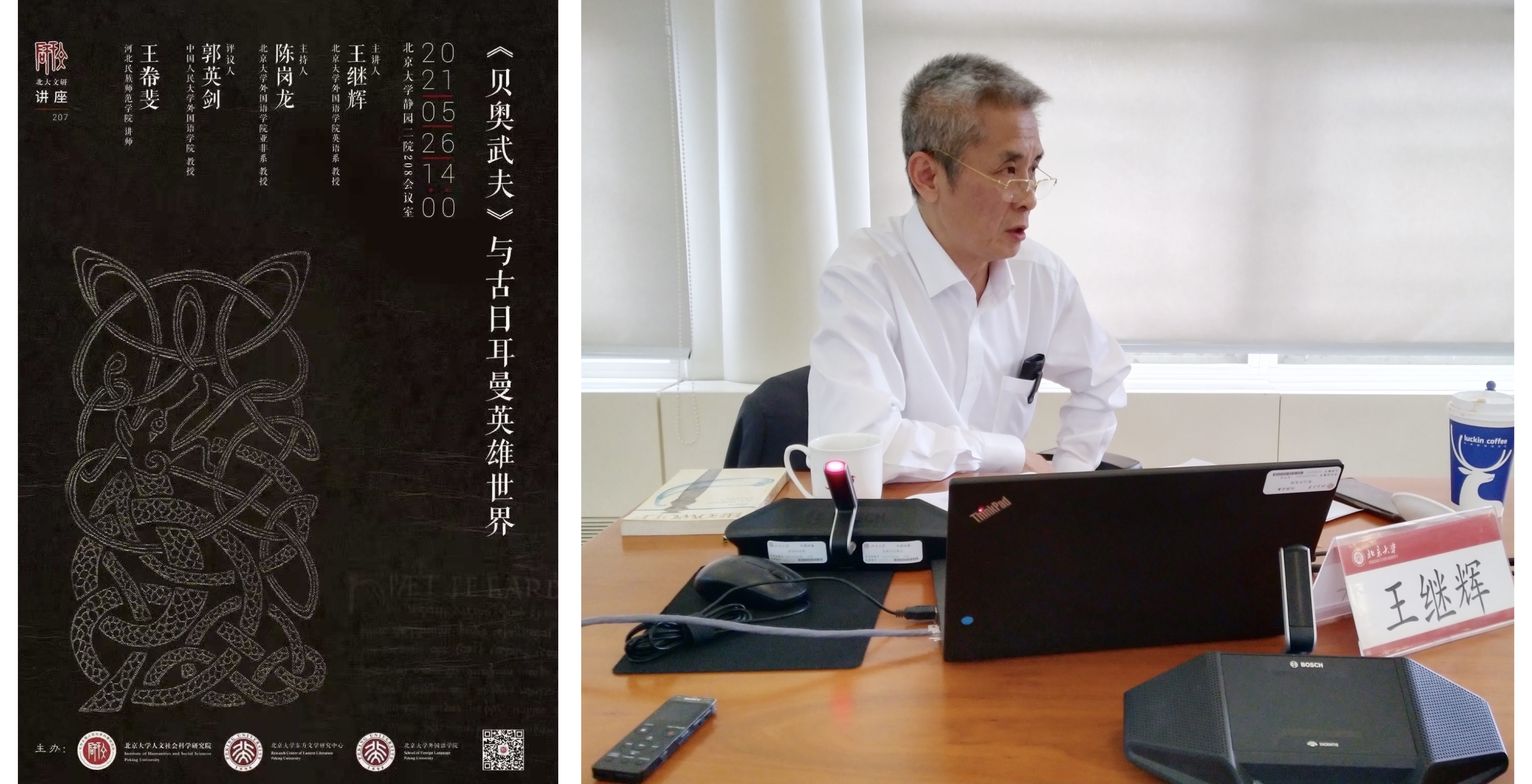 2021年5月26日下午,开云官方网页版英语系王继辉教授主讲的“《贝奥武夫》与古日耳曼英雄世界”讲座在线下线上同步举行。本次讲座由陈岗龙教授主持,中国人民大学开云官方网页版郭英剑教授、河北民族师范学院王帣斐老师评议。