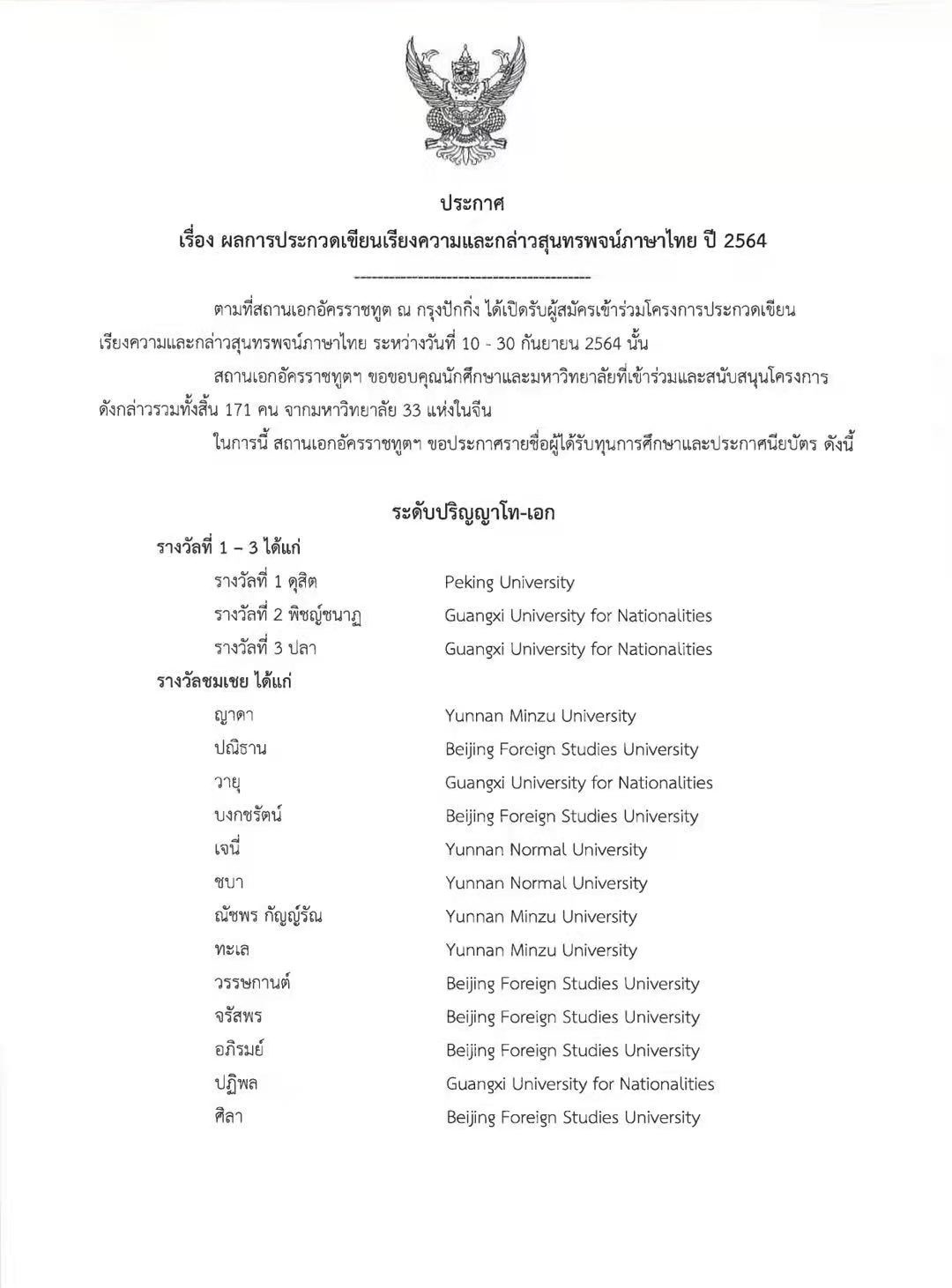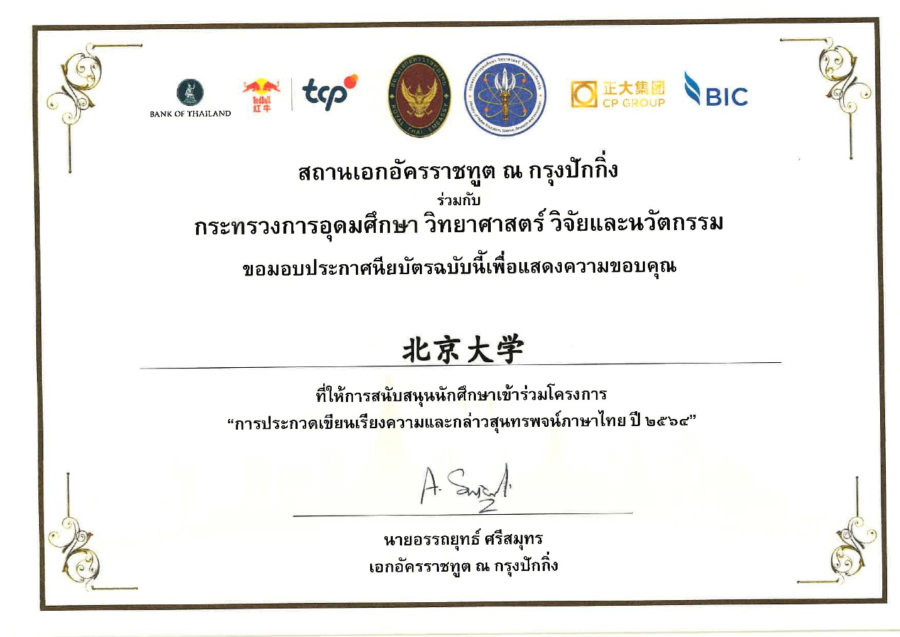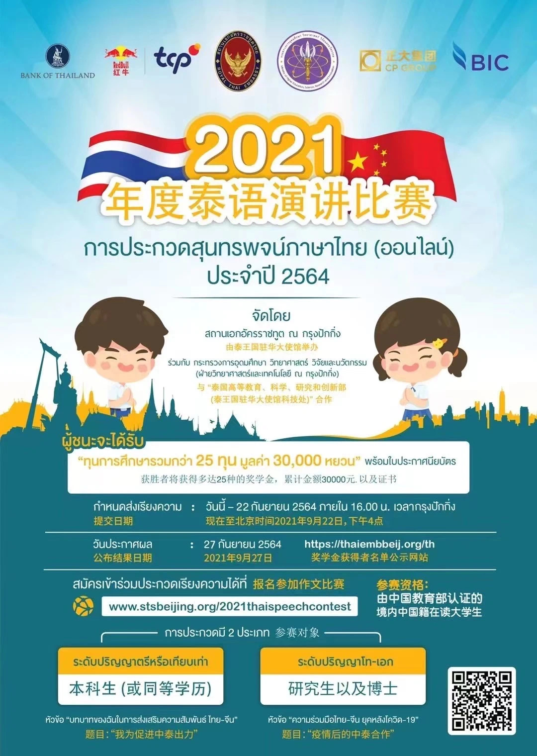 2021年9月10日至30日,“2021年度全国泰语演讲比赛”在线上举行,开云官方网页版东南亚系2018级泰语专业硕士生陈洪锋在众多参赛选手中脱颖而出,荣获硕-博组第一名。此次演讲比赛由泰国驻中国大使馆主办,旨在促进中泰之间的教育、语言和文化交流,获得了泰国高等教育科研与创新部(Ministry of Higher Education, Science, Research and Innovation)、泰国中央银行(Bank of Thailand)、天丝集团(TCP Group)、红牛饮料有限公司(Red Bull Beverage Co.,Ltd.)、正大集团(CP Group)等多所机构的支持。此次演讲比赛是泰国驻中国大使馆举办的第二届全国性泰语演讲比赛,分为“写作”和“演讲”两个部分。虽然受疫情影响,此次演讲比赛以线上形式举办,但参与院校数和参赛人数均远超以往。据统计,主办方共收到来自全国33所高校泰语专业本硕博学生的踊跃投稿,参加人数达171人。