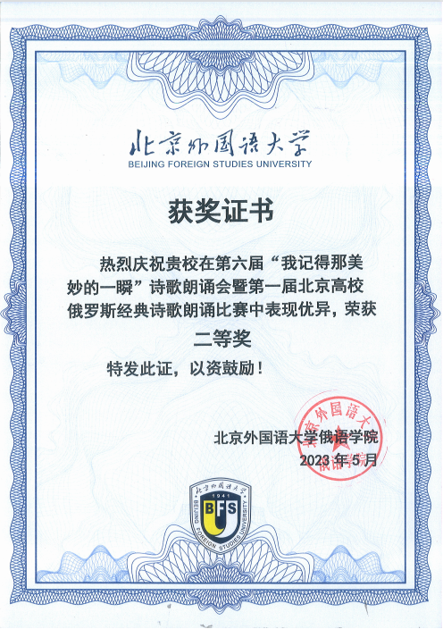 2023年5月6日,由北京外国语大学、外研书店以及“俄语开讲啦”公众号主办的第六届“我记得那美妙的一瞬”诗歌朗诵会暨第一届北京高校俄罗斯经典诗歌朗诵比赛决赛顺利举办。北京大学俄语系本科生李承远(2021级)、苏传顺(2021级)、苏蒙娅(2021级)、孙宇汀(2021级)、魏家朋(2021级)、陈梦遥(2022级)与王心颜(2022级)组队参赛。