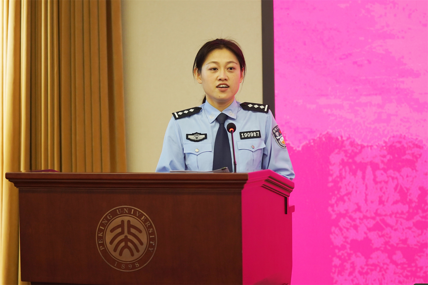 丁一老师介绍今年是中韩建交31周年,中朝建交74周年,中国与韩、朝两国一直有着多领域密切的交流。她就我国朝鲜语、韩语外语教育的历史,以及北京大学朝(韩)语系的历史和师资力量做了简要的介绍,并介绍了朝(韩)语系就本次培训进行的精心准备和课程设计。她表示,老师们期待与大家在课堂上相见,希望通过这次培训,对各位警员的业务能力提升起到促进和助力的作用,也希望燕园的夏日能给各位警员编织一段美好的回忆。