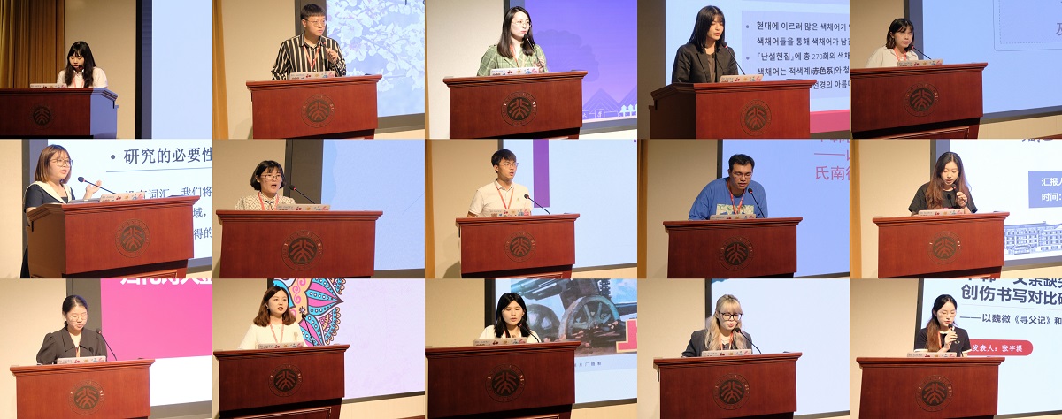 韩国文学组发言讨论于下午进行,由北京大学文丽华老师和南京大学尹海燕老师先后担任主持。南京大学郭佩尧同学、北京大学董冠麟同学、北京大学张可佳同学、山东大学于新宇同学、山东大学王丽媛同学、南京大学孙慧敏同学、北京大学杨曦同学、北京大学张宇淏同学先后以《<高丽史·乐志二>收录“唐乐”词牌考》《中韩世情小说中的恶女形象比较——以<金瓶梅>中的潘金莲和<谢氏南征记>中的乔彩鸾为中心》《朝鲜朝后期小说<淑香传>中的“瑶池”空间叙事研究》《归化诗人金少芝汉诗中家国情怀与东亚观》《论抗日语境下东亚戏剧的安重根叙事》《电影<上甘岭>(1956)和“社会主义美学”的诞生》《皮尔斯符号学视域下<陌生人的房间>“光”意象的研究》《中韩“父亲缺失”母题成长小说中女性创伤书写对比研究——以魏微<寻父记>和金爱烂<老爸,快跑>为研究对象》为题发言。