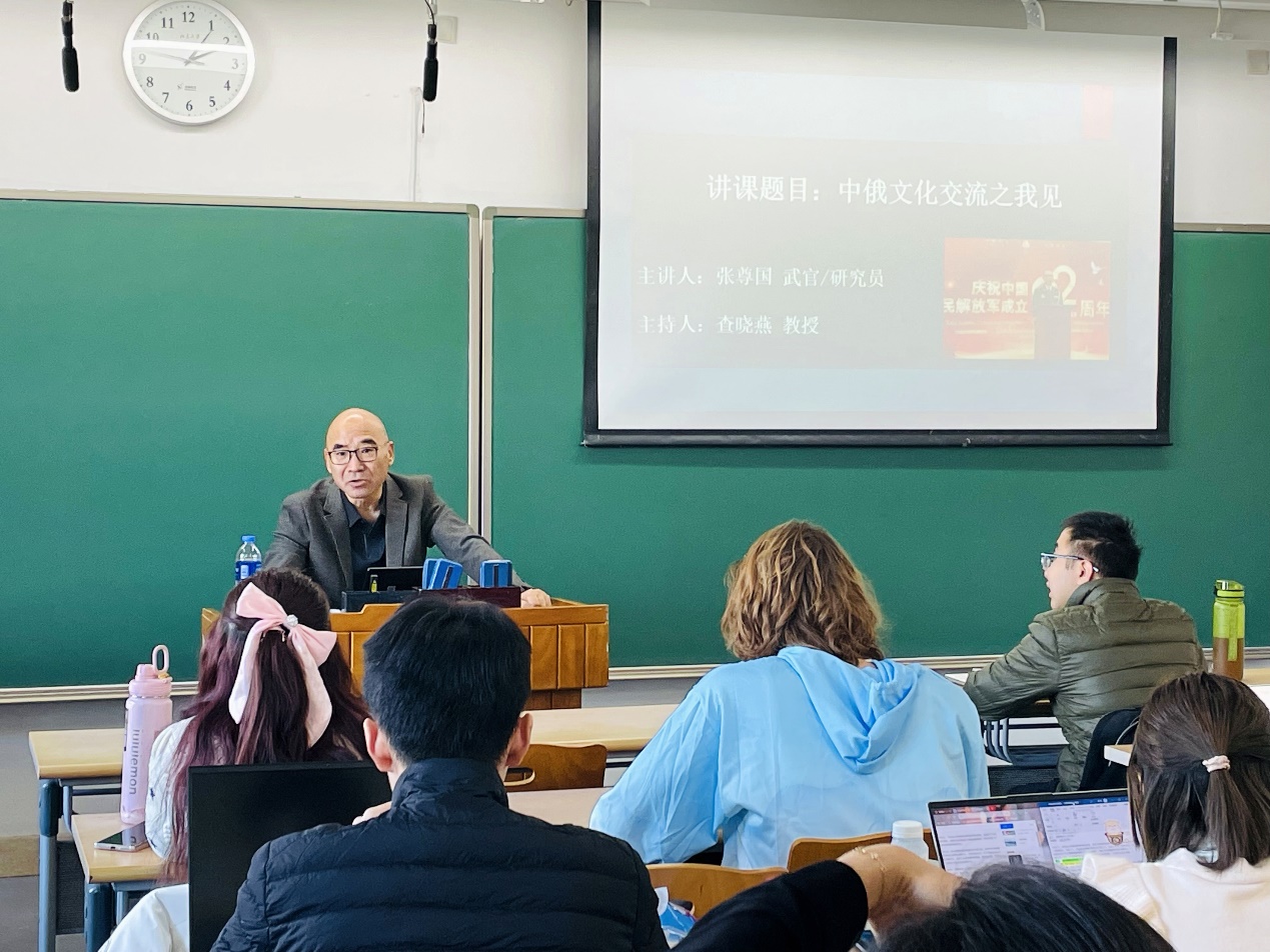 张武官向同学分享了自己多年与俄语居民交往的亲身经历与体会。他从俄国古代军事题材文学艺术创作开始,讲述了俄罗斯军事文化的基本特征,内容涵盖俄罗斯军事发展史、国家传统军事战略、爱国主义教育、现代军官待遇等;他还结合自身经历,总结了中俄文化交流的关键要点,提出与俄语居民平等交流的前提背景是我国经济、国力的发展,而且需要具备良好的语言功底与文化素养,充分了解对象国的民间文化;更主要的是真诚的态度,想要达成有效的双向交流,就要能够真心实意地尊重并理解对方的文化。