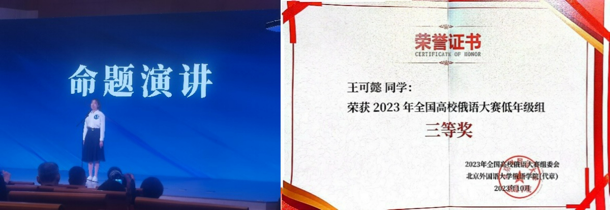 2023年10月27日至10月29日,在北京外国语大学举行了全国高校俄语大赛的复赛、决赛。本次大赛由教育部国际合作与交流司主办,北京外国语大学承办,共设低年级组、高年级组和研究生组3个组别。初赛为线上进行,按照赛制,低年级组25人、高年级组22人及研究生组13人进入复赛。复赛、决赛于10月28日至29日在北京外国语大学举行,以命题演讲、即兴口语表述和俄汉双向交替传译等形式,考查选手的俄语语言技能和对俄罗斯国情文化的综合了解,以及用俄语讲好中国故事的能力。我系本科二年级的王可懿同学在外籍教师叶莲娜•马尔卡索娃(Маркасова Елена Валерьевна)的帮助下,精心准备了题为«Учись. Увлекайся. Старайся.»的演讲,并进行了造句比赛,最终取得了低年级组三等奖的成绩。