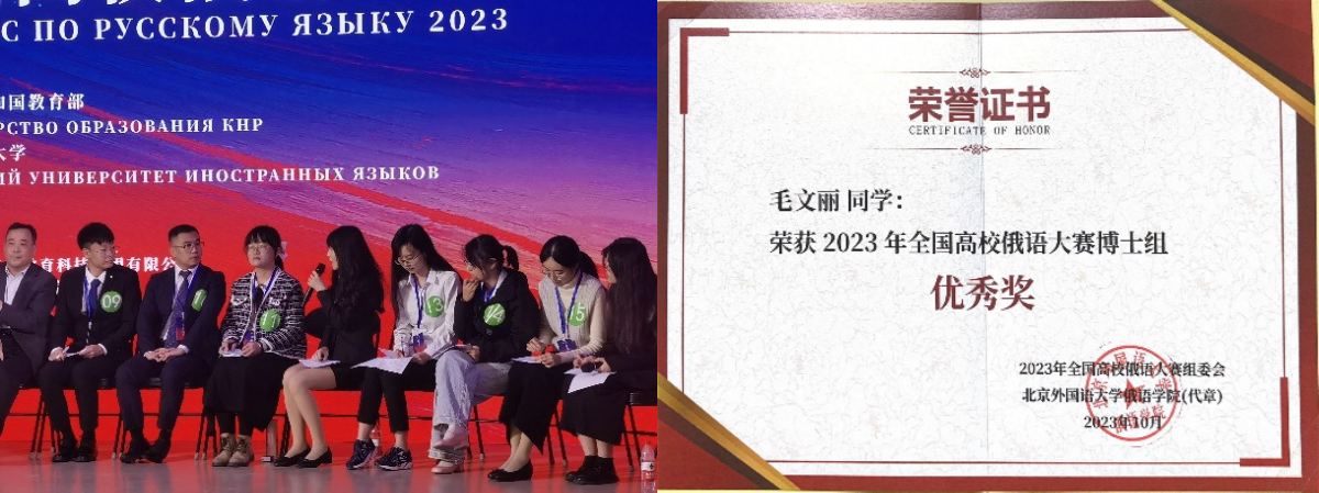 此外,为全面反映我国高校俄语教育的最新成就,大赛还特别设有博士生圆桌论坛。来自全国16所高校的16名博士生以“服务‘一带一路’建设:青年的使命与担当”为题展开讨论。最终由评委会评选出一等奖1人、二等奖2人、三等奖3人和优秀奖10人。我系博士生毛文丽获得了优秀奖,代表研究生组参赛的俞文沁获初试优秀奖。