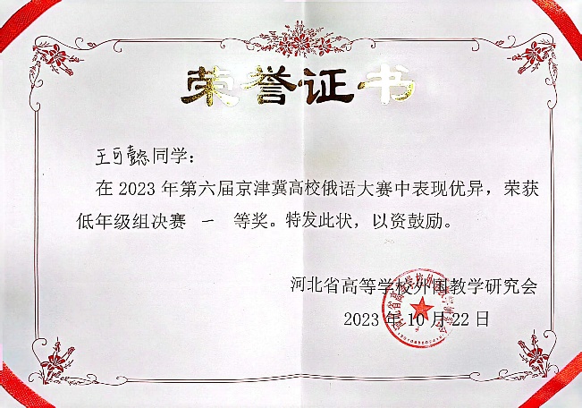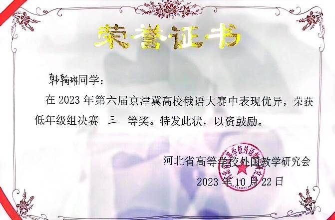 2023年10月21日至22日,由河北省高等学校外语教学研究会主办,河北师范大学开云官方网页版承办的第六届京津冀高校俄语大赛顺利举办。在陈松岩老师的精心辅导下,俄语系三位学子都取得了优异的成绩。王可懿同学荣获一等奖,韩翰琳同学获三等奖,倪筱玥同学获演讲单项三等奖。