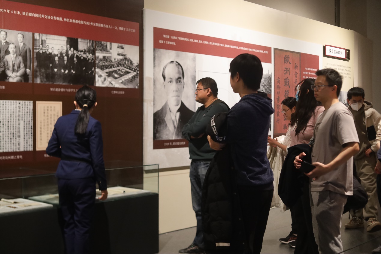 常设展厅参观完毕后,师生们前往特设展览进行参观。本次课程实践恰逢华侨博物馆“在首都遇见侨乡·广东江门主题月”活动,共推出“侨·梁——梁启超与近代华侨华人”、“侨批中的党史——江门侨批活化研究成果展”两个专题展览。