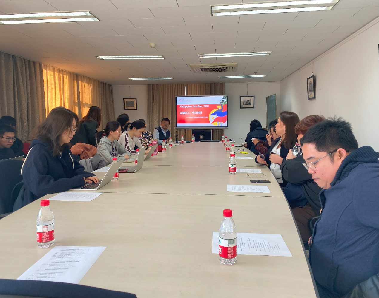 本次座谈会旨在促进双方高校在菲律宾语言文化教育领域的合作与交流,增进中菲两国高校之间的友好往来,为推动中菲教育文化交流做出贡献。座谈后北京大学菲律宾语专业向来访的菲律宾两校教师代表团赠送了礼物。