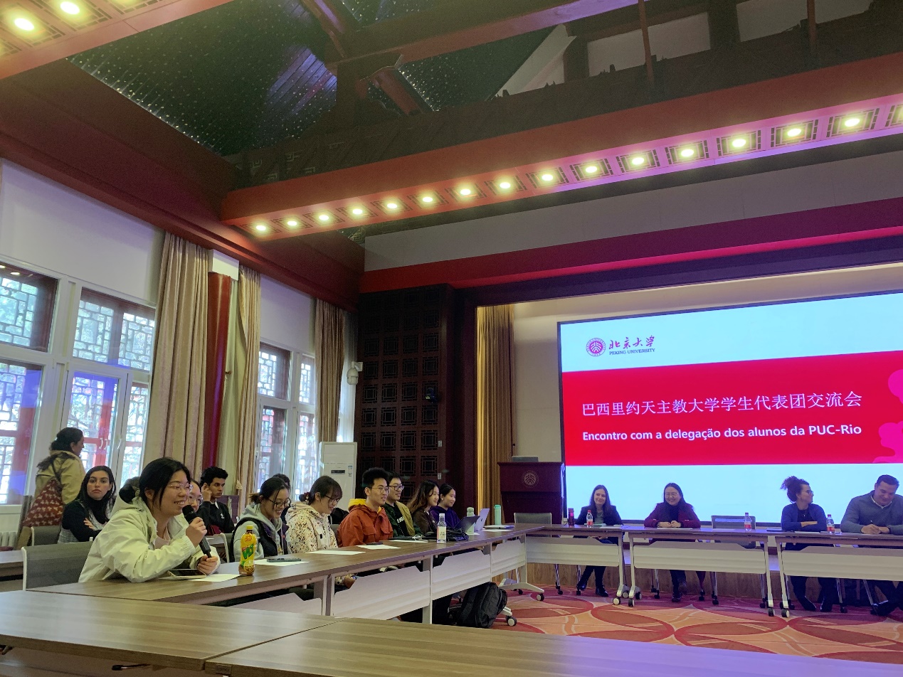 交流活动在北京大学民主楼208室举行。来宾到场后,葡语专业学生便与巴西同学就中巴文化、校园生活等话题进行了自由问答。这不仅加深了双方的相互理解,也为本次活动奠定了友好的基调。
