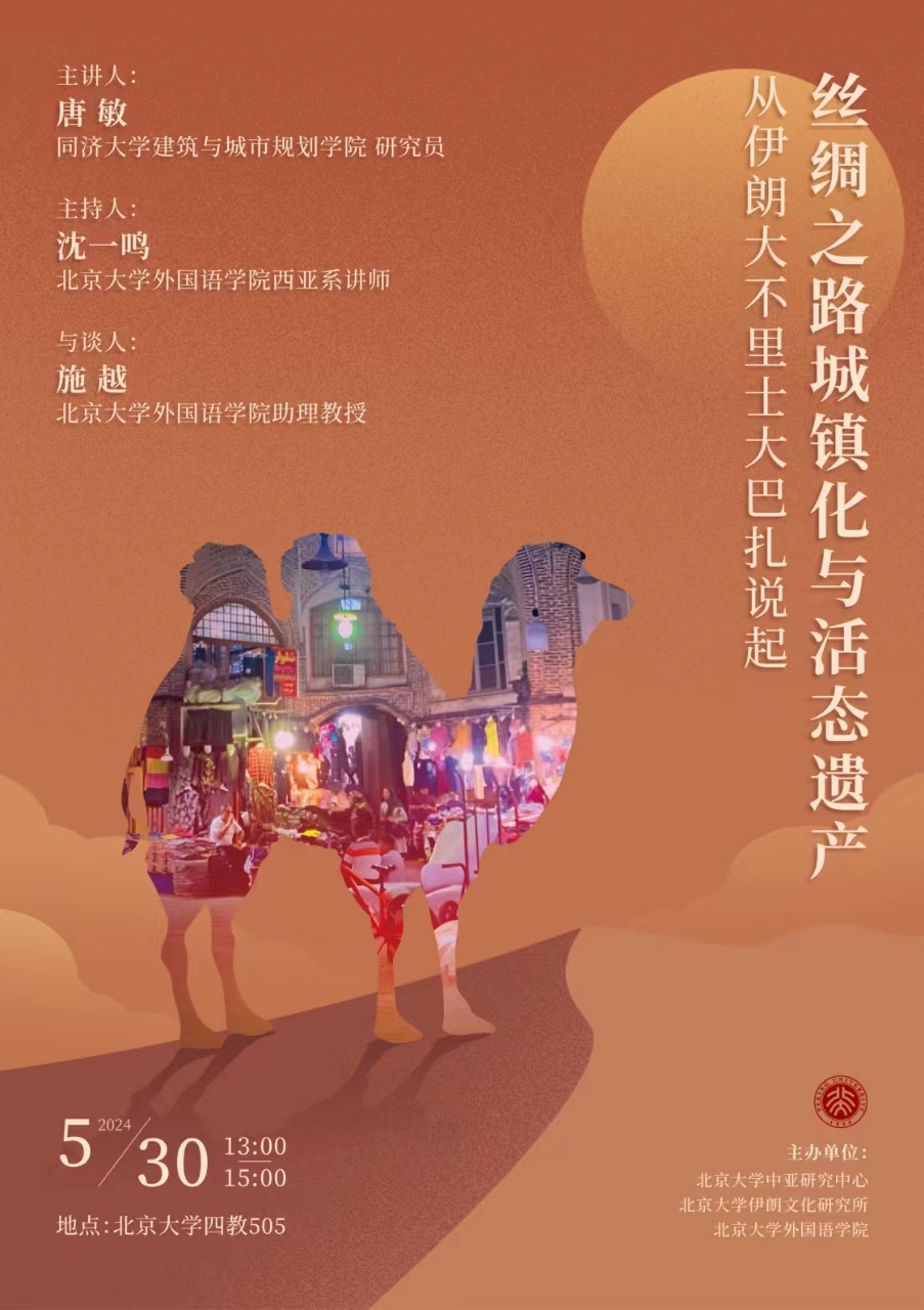 2024年5月30日,由北京大学中亚研究中心、北京大学伊朗文化研究所、开云官方网页版联合主办的讲座“丝绸之路城镇化与活态遗产:从伊朗大不里士大巴扎说起”在北京大学第四教学楼505教室成功举办。本次讲座由同济大学建筑与城市规划学院研究员唐敏主讲,开云官方网页版西亚系讲师沈一鸣主持,开云官方网页版助理教授施越与谈。