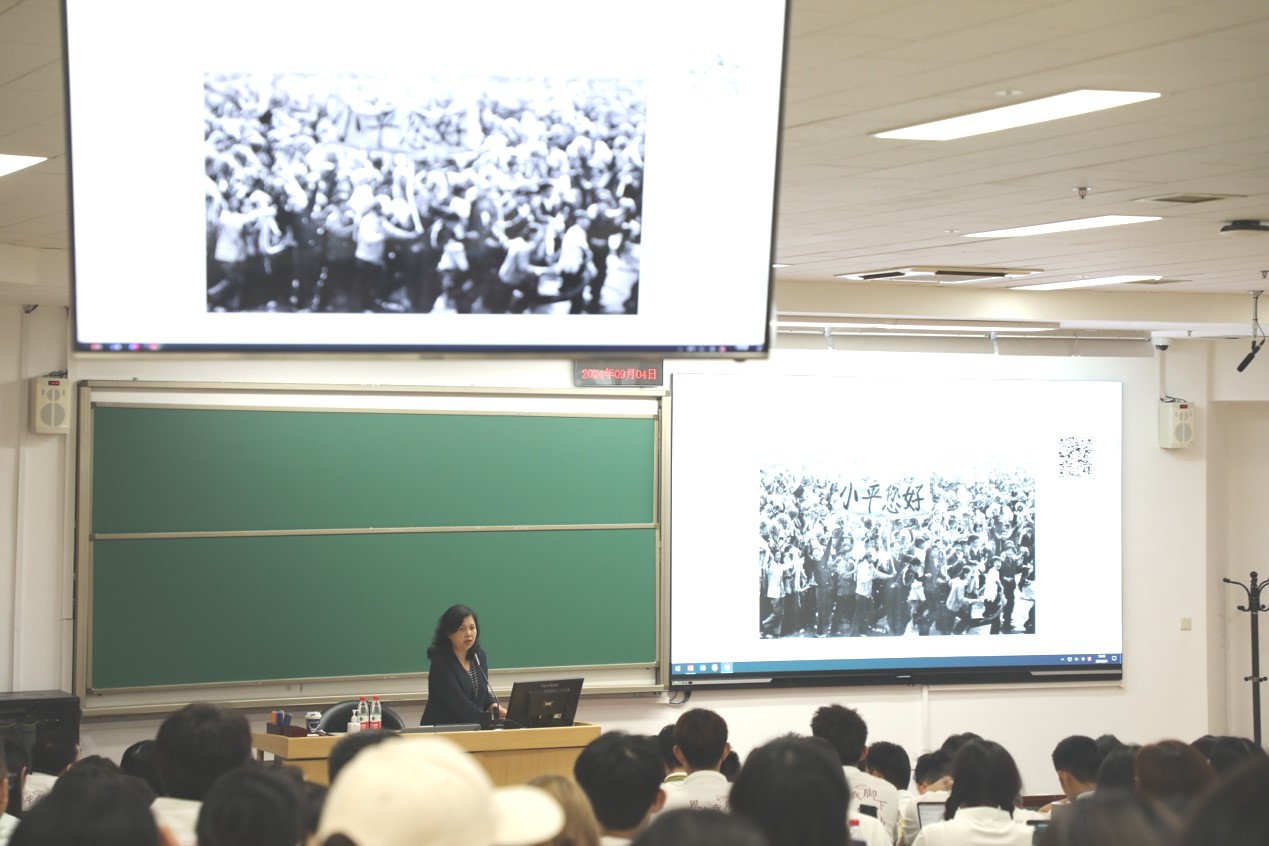 李淑静从一张老照片讲起。照片展示了国庆35周年群众游行时,北京大学学生走过天安门打出“小平您好”的横幅,李淑静奔跑的身影定格进这张珍贵的照片。作为亲历者,她寄语同学们:时代在变,但北大人对党和国家的热爱,对美好未来的向往始终如一。