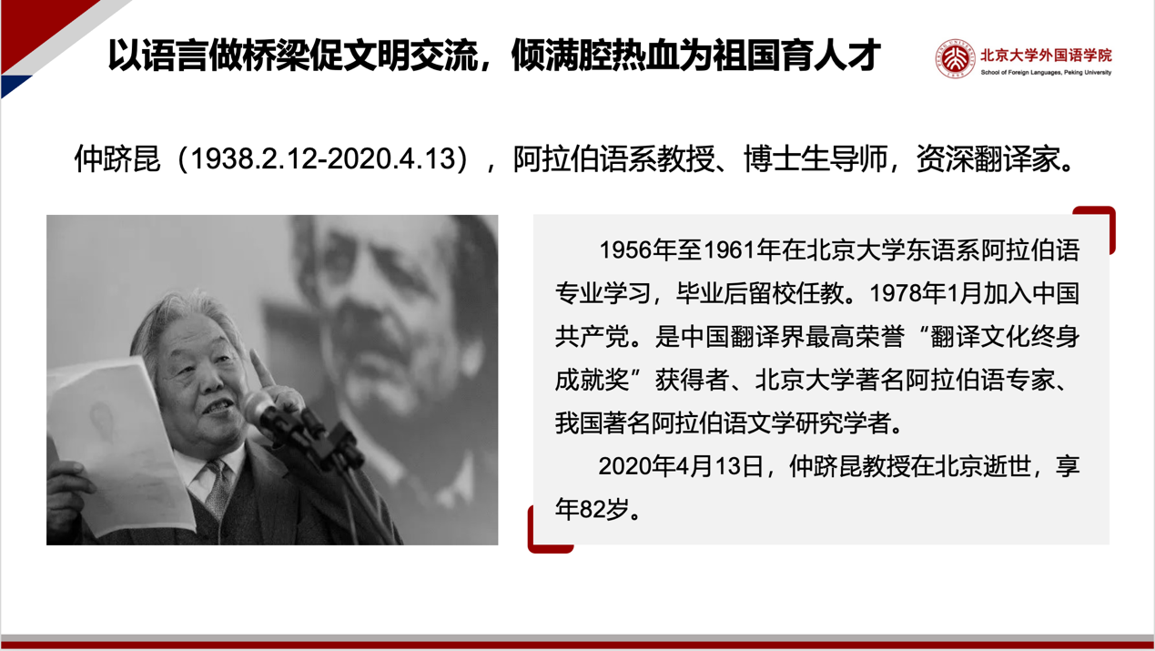 阿拉伯语系仲跻昆教授是我国资深翻译家。阿拉伯语被认为是世界上最难学的语言之一,但他始终坚信“难能可贵”,因其难,学出来“才算有本事”。在他心目中,学习阿拉伯语是为了国家的发展需要,从事翻译工作,是为中阿文化交流架起桥梁,也是为人类文化文明的传承、借鉴、创新做出贡献。他还是一位杰出的教育家,常言“老师要腾出自己的肩膀,让学生踩着,向上攀登。”作为一名共产党员,他怀着一颗赤子之心,为人师表、提携后学,为教育事业倾注了满腔热血。