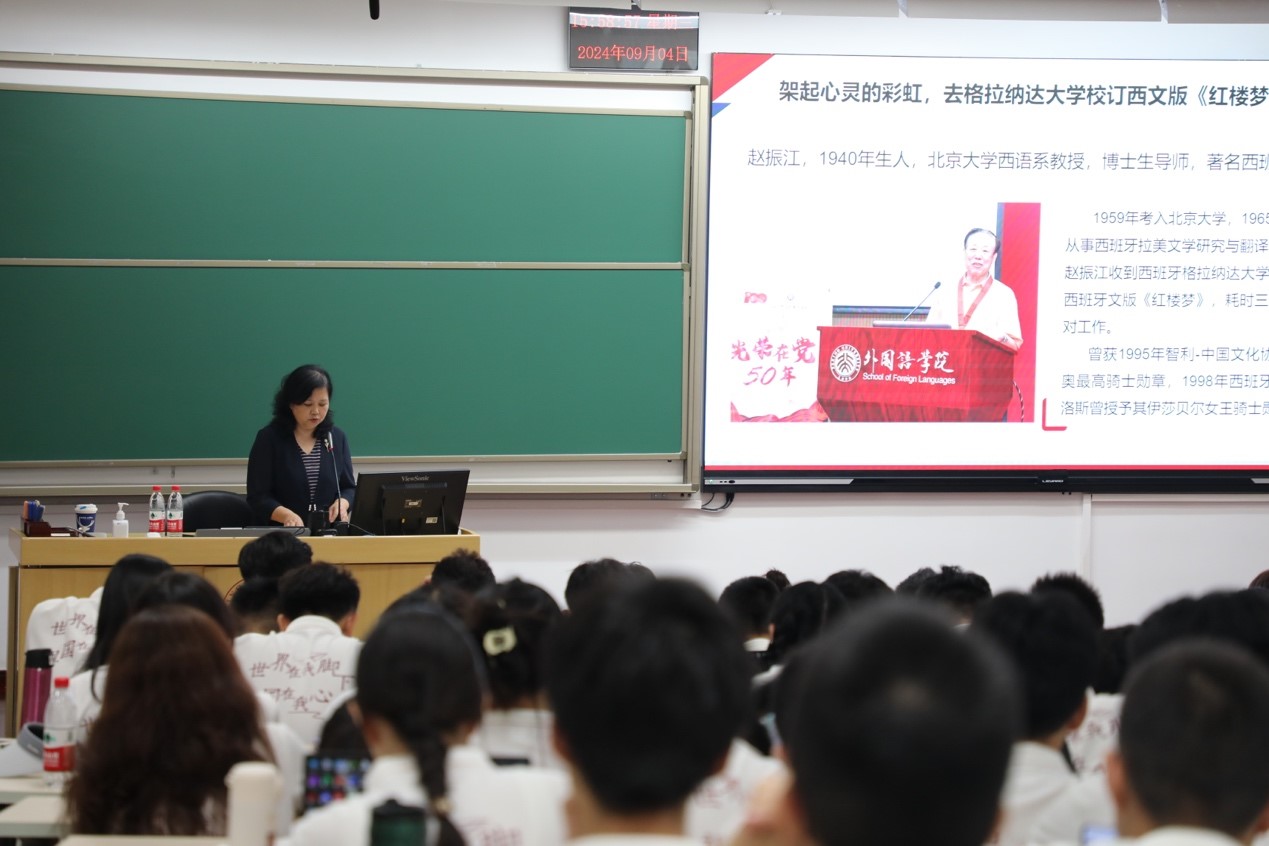 赵振江教授是著名西班牙语翻译家、教育家。他曾历时三年,在西班牙格拉纳达大学参与《红楼梦》西文版的翻译、校订工作,与西班牙当地学者协作,精益求精,反复推敲,历经艰辛与挑战,让伊比利亚半岛的读者领略到这部中国古典文学名著的独特魅力。赵老师热爱翻译事业,他曾说,“文化交流宛如在人们的心灵中架起一道绚丽的彩虹,能为她添上几笔颜色,是十分令人欣慰的事情。”