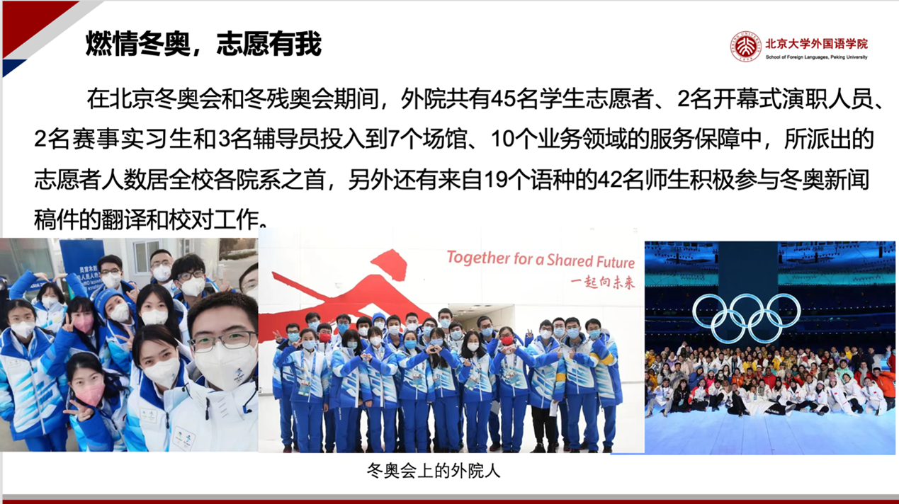 在2022年北京冬奥会和冬残奥会中,学院45名学生志愿者、2名演职人员、2名赛事实习生和3名辅导员在7个场馆、10个领域提供服务,另外还有19个语种的同学在青年教师的带领和指导下参与冬奥新闻稿件的翻译和校对工作。青年志愿者们以饱满的爱国热情、扎实的专业功底、过硬的综合素质向世界展示中国青年形象、传递中国声音,用实际行动彰显了新时代青年的责任担当。