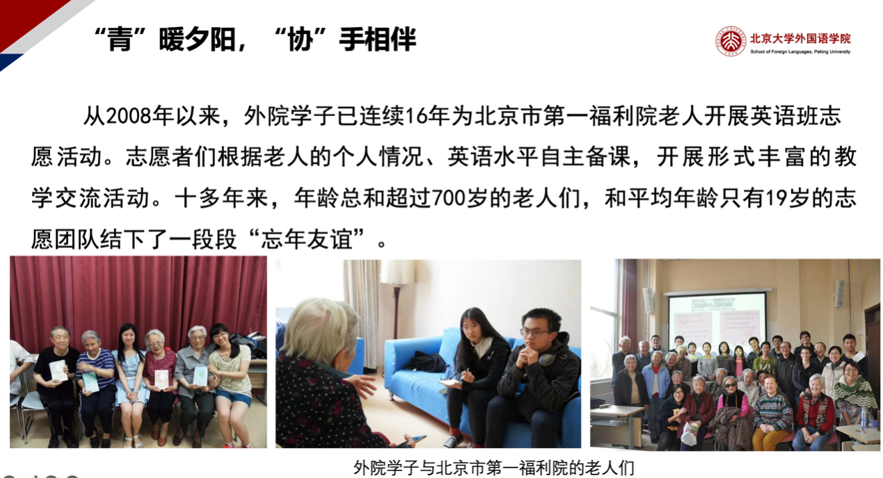 2008年以来,外院学子已连续16年为北京市第一福利院的老人提供英语教学志愿服务。志愿者根据老人的学习需求、学习情况原创课程内容与授课讲义,并开展丰富的课外活动,提高老人们的幸福感、获得感。十多年来,一代代志愿者始终践行“以语相伴,用爱传承”的志愿精神,为老人们送去知识、陪伴与欢乐,也从老人们那里汲取智慧、力量和信念。