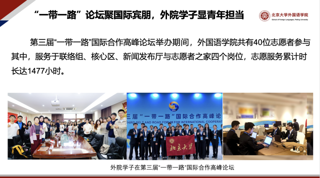 在2023年第三届“一带一路”国际合作高峰论坛中,学院40位志愿者参与其中,服务于联络组、核心区、新闻发布厅与志愿者之家。在带队老师与志愿者的通力合作下,外院人再次用行动诠释了“奉献、友爱、互助、进步”的志愿精神,为论坛提供了多方位、全流程、高质量的服务和支持,给与会嘉宾留下了深刻印象,成为“一带一路”国际合作高峰论坛一道靓丽的风景线。