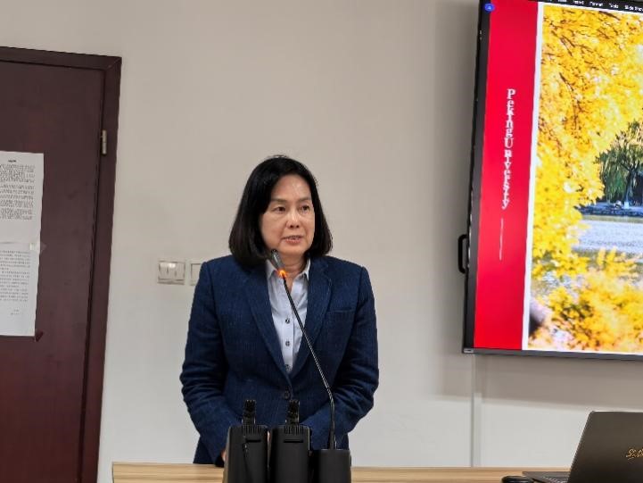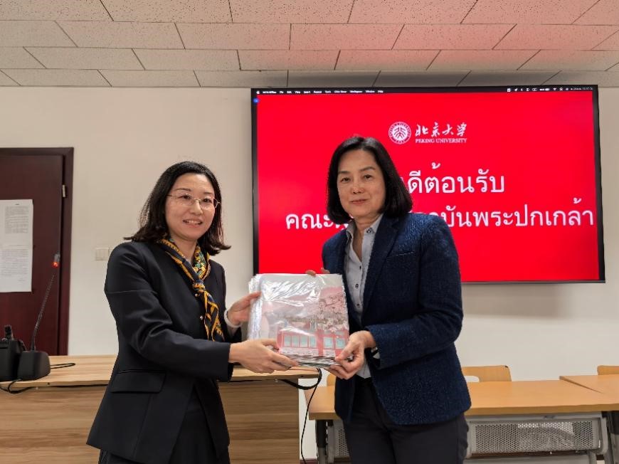 座谈会在外院新楼B135室举行,由泰语专业研究生熊珊儿担任主持人。熊燃老师首先代表北大泰语专业向泰国七世王学院的再次到访表示欢迎,并向来宾介绍了近年来泰语专业与泰国高校师生开展文化交流的情况。接下来,泰语专业2024级硕士生罗燕介绍了北京大学的历史与现状。2022级本科生代表苏煜分享了暑期赴泰国朱拉隆功大学交流实践的经历以及学习泰语的感受。随后,熊燃老师与道诺伊·素提尼帕蓬女士互赠礼品。